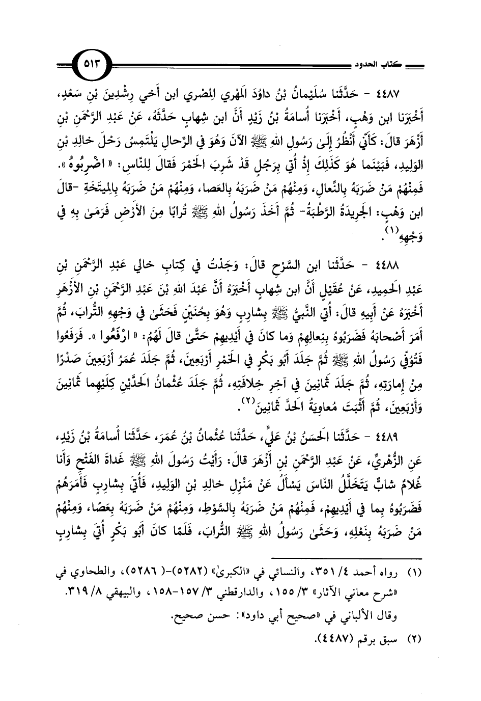 4488 - حَدَّثَنا ابن السَّرْحِ قالَ: وَجَدْتُ في كِتابِ خالي عَبْدِ الرَّحْمَنِ بْنِ عَبْدِ الحَمِيدِ، عَنْ عُقَيْلٍ أَنَّ ابن شِهابٍ أَخْبَرَهُ أَنَّ عَبْدَ اللَّهِ بْنَ عَبْدِ الرَّحْمَنِ بْنِ الأَزْهَرِ أَخْبَرَهُ عَنْ أَبِيهِ قالَ: أُتي النَّبيُّ -صلى اللَّه عليه وسلم- بشارِبٍ وَهُوَ بِحُنَيْنٍ فَحَثَى في وَجْهِهِ التُّرابَ، ثُمَّ أَمَرَ أَصْحابَهُ فَضَرَبُوهُ بِنِعالِهِمْ وَما كانَ في أَيْدِيهِمْ حَتَّى قالَ لَهُمُ: "ارْفَعُوا". فَرَفَعُوا فَتُوُفّي رَسُولُ اللَّهِ -صلى اللَّه عليه وسلم- ثُمَّ جَلَدَ أَبُو بَكْرٍ في الخَمْرِ أَرْبَعِينَ، ثمَّ جَلَدَ عُمَرُ أَرْبَعِينَ صَدْرًا مِنْ إِمارَتِهِ، ثُمَّ جَلَدَ ثَمانِينَ في آخِرِ خِلافَتِهِ، ثُمَّ جَلَدَ عُثْمانُ الحَدَّيْنِ كِلَيْهِما ثَمانِينَ وَأَرْبَعِينَ، ثُمَّ أَثْبَتَ مُعاوِيَةُ الحَدَّ ثَمانِينَ (¬2).