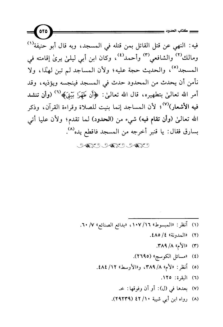 فيه: النهي عن قتل القاتل بمن قتله في المسجد، وبه قال أبو حنيفة (¬1) ومالك (¬2) والشافعي (¬3) وأحمد (¬4)، وكان ابن أبي ليلى يرى إقامته في المسجد (¬5)، والحديث حجة عليه؛ ولأن المساجد لم تبن لهذا، ولا نأمن أن يحدث من المحدود حدث في المسجد فينجسه ويؤذيه، وقد أمر اللَّه تعالى بتطهيره، قال اللَّه تعالى: {أَنْ طَهِّرَا بَيْتِيَ} (¬6) (وأن تنشد فيه الأشعار) (¬7)؛ لأن المساجد إنما بنيت للصلاة وقراءة القرآن، وذكر اللَّه تعالى (وأن تقام فيه) شيء من (الحدود) لما تقدم؛ ولأن عليا أتي بسارق فقال: يا قنبر أخرجه من المسجد فاقطع يده (¬8).