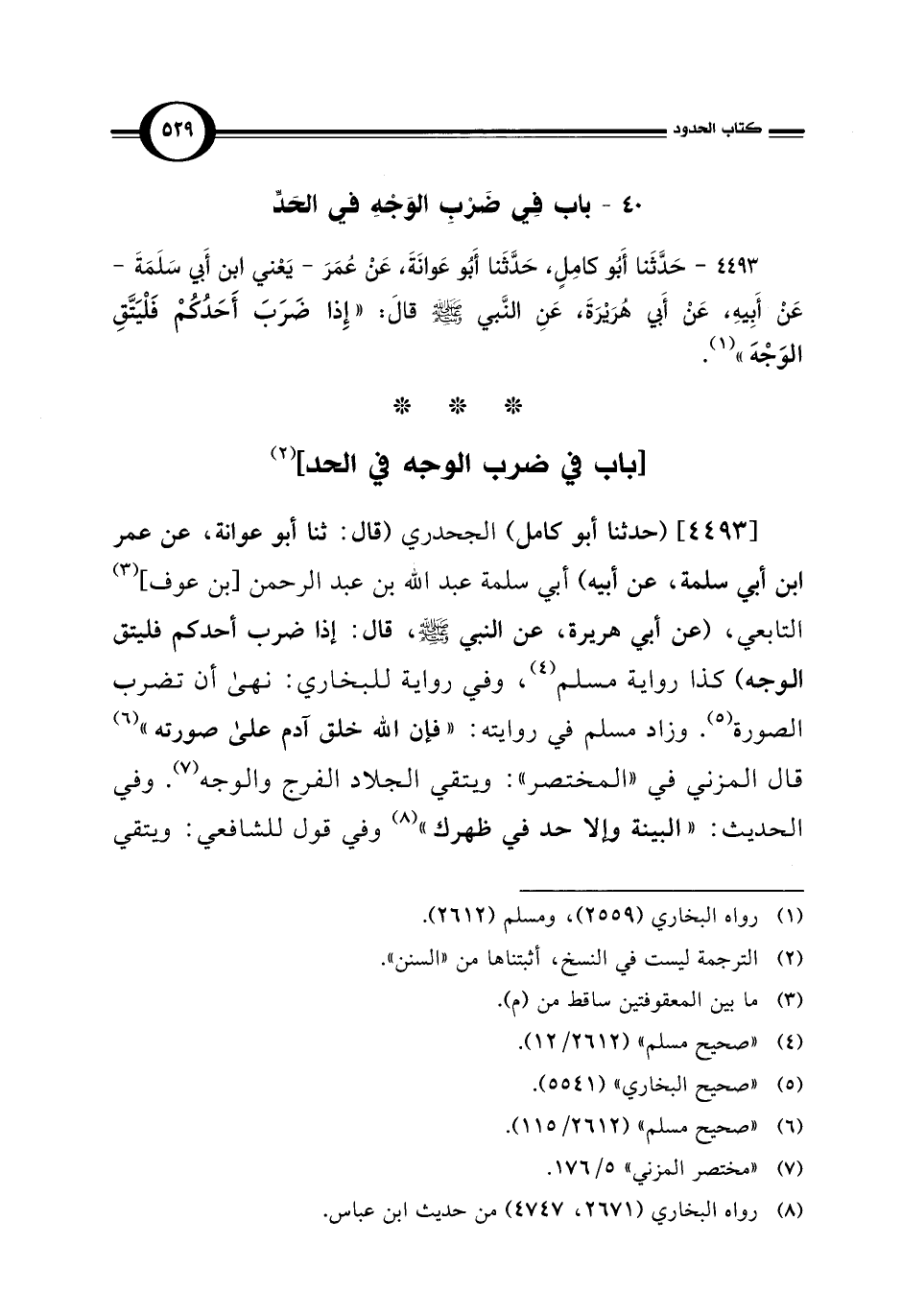 [4493] (حدثنا أبو كامل) الجحدري (قال: ثنا أبو عوانة، عن عمر ابن أبي سلمة، عن أبيه) أبي سلمة عبد اللَّه بن عبد الرحمن [بن عوف] (¬3) التابعي، (عن أبي هريرة، عن النبي -صلى اللَّه عليه وسلم-، قال: إذا ضرب أحدكم فليتق الوجه) كذا رواية مسلم (¬4)، وفي رواية للبخاري: نهى أن تضرب الصورة (¬5). وزاد مسلم في روايته: "فإن اللَّه خلق آدم على صورته" (¬6) قال المزني في "المختصر": ويتقي الجلاد الفرج والوجه (¬7). وفي الحديث: "البينة وإلا حد في ظهرك" (¬8) وفي قول للشافعي: ويتقي