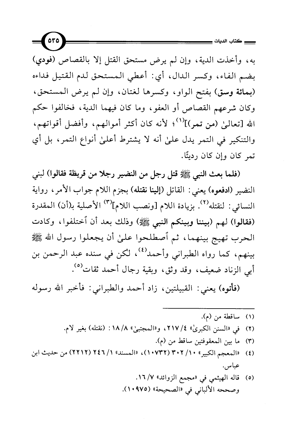 (فلما بعث النبي -صلى اللَّه عليه وسلم- قتل رجل من النضير رجلا من قريظة فقالوا) لبني النضير (ادفعوه) يعني: القاتل (إلينا نقتله) بجزم اللام جواب الأمر، رواية النسائي: لنقتله (¬2). بزيادة اللام [ونصب اللام] (¬3) الأصلية بـ (أن) المقدرة (فقالوا) لهم (بيننا وبينكم النبي -صلى اللَّه عليه وسلم-) وذلك بعد أن اختلفوا، وكادت الحرب تهيج بينهما، ثم اصطلحوا على أن يجعلوا رسول اللَّه -صلى اللَّه عليه وسلم- بينهم، كما رواه الطبراني وأحمد (¬4)، لكن في سنده عبد الرحمن بن أبي الزناد ضعيف، وقد وثق، وبقية رجال أحمد ثقات (¬5).