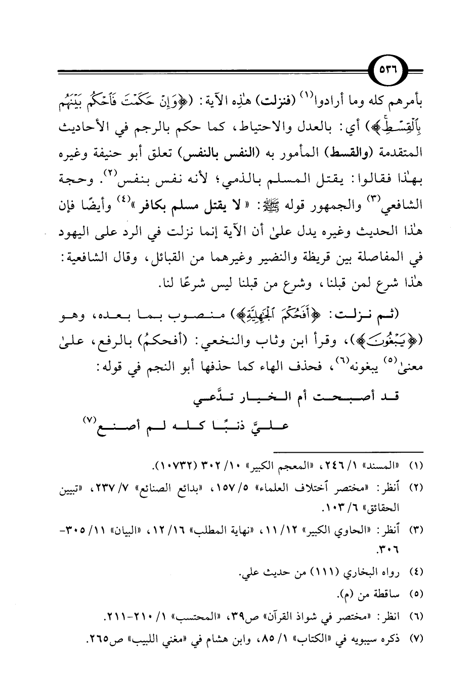 بأمرهم كله وما أرادوا (¬1) (فنزلت) هذِه الآية: ({وَإِنْ حَكَمْتَ فَاحْكُمْ بَيْنَهُمْ بِالْقِسْطِ}) أي: بالعدل والاحتياط، كما حكم بالرجم في الأحاديث المتقدمة (والقسط) المأمور به (النفس بالنفس) تعلق أبو حنيفة وغيره بهذا فقالوا: يقتل المسلم بالذمي؛ لأنه نفس بنفس (¬2). وحجة الشافعي (¬3) والجمهور قوله -صلى اللَّه عليه وسلم-: "لا يقتل مسلم بكافر" (¬4) وأيضًا فإن هذا الحديث وغيره يدل على أن الآية إنما نزلت في الرد على اليهود في المفاصلة بين قريظة والنضير وغيرهما من القبائل، وقال الشافعية: هذا شرع لمن قبلنا، وشرع من قبلنا ليس شرعًا لنا.