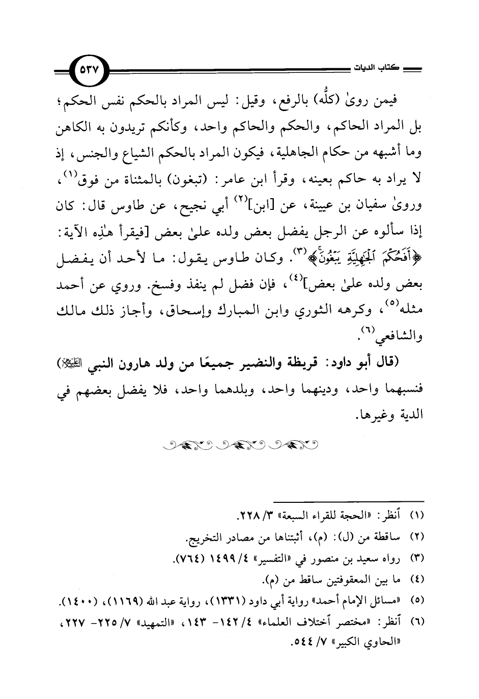 فيمن روى (كلُّه) بالرفع، وقيل: ليس المراد بالحكم نفس الحكم؛ بل المراد الحاكم، والحكم والحاكم واحد، وكأنكم تريدون به الكاهن وما أشبهه من حكام الجاهلية، فيكون المراد بالحكم الشياع والجنس، إذ لا يراد به حاكم بعينه، وقرأ ابن عامر: (تبغون) بالمثناة من فوق (¬1)، وروى سفيان بن عيينة، عن [ابن] (¬2) أبي نجيح، عن طاوس قال: كان إذا سألوه عن الرجل يفضل بعض ولده على بعض [فيقرأ هذِه الآية: {أَفَحُكْمَ الْجَاهِلِيَّةِ يَبْغُونَ} (¬3). وكان طاوس يقول: ما لأحد أن يفضل بعض ولده على بعض] (¬4)، فإن فضل لم ينفذ وفسخ. وروي عن أحمد مثله (¬5)، وكرهه الثوري وابن المبارك وإسحاق، وأجاز ذلك مالك والشافعي (¬6).