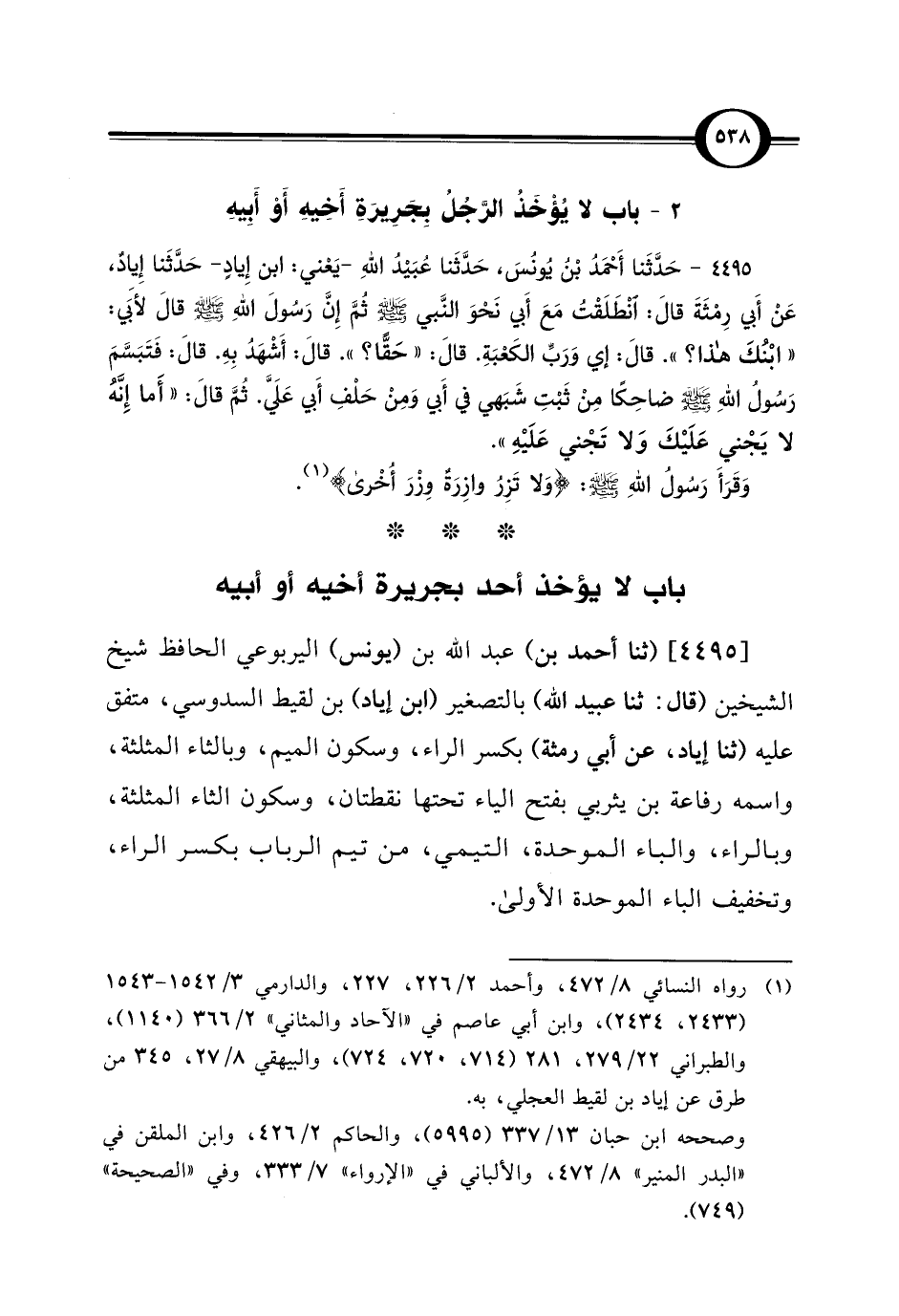 [4495] (ثنا أحمد بن) عبد اللَّه بن (يونس) اليربوعي الحافظ شيخ الشيخين (قال: ثنا عبيد اللَّه) بالتصغير (ابن إياد) بن لقيط السدوسي، متفق عليه (ثنا إياد، عن أبي رمثة) بكسر الراء، وسكون الميم، وبالثاء المثلثة، واسمه رفاعة بن يثربي بفتح الياء تحتها نقطتان، وسكون الثاء المثلثة، وبالراء، والباء الموحدة، التيمي، من تيم الرباب بكسر الراء، وتخفيف الباء الموحدة الأولى.