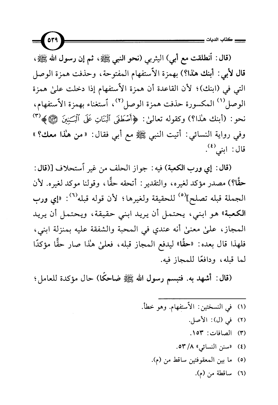 (قال: إي ورب الكعبة) فيه: جواز الحلف من غير استحلاف [(قال: حقًّا؟ ) مصدر مؤكد لغيره، والتقدير: أتحقه حقًّا، وقولنا موكد لغيره. لأن الجملة قبله تصلح] (¬5) للحقيقة ولغيرها؛ لأن قوله قبله (¬6): "إي ورب الكعبة" هو ابني، يحتمل أن يريد ابني حقيقة، ويحتمل أن يريد المجاز، على معنى أنه عندي في المحبة والشفقة عليه بمنزلة ابني، فلهذا قال بعده: "حقًّا" ليدفع المجاز قبله، فعلى هذا صار حقًّا مؤكدًا لما قبله، ودافعًا للمجاز فيه.