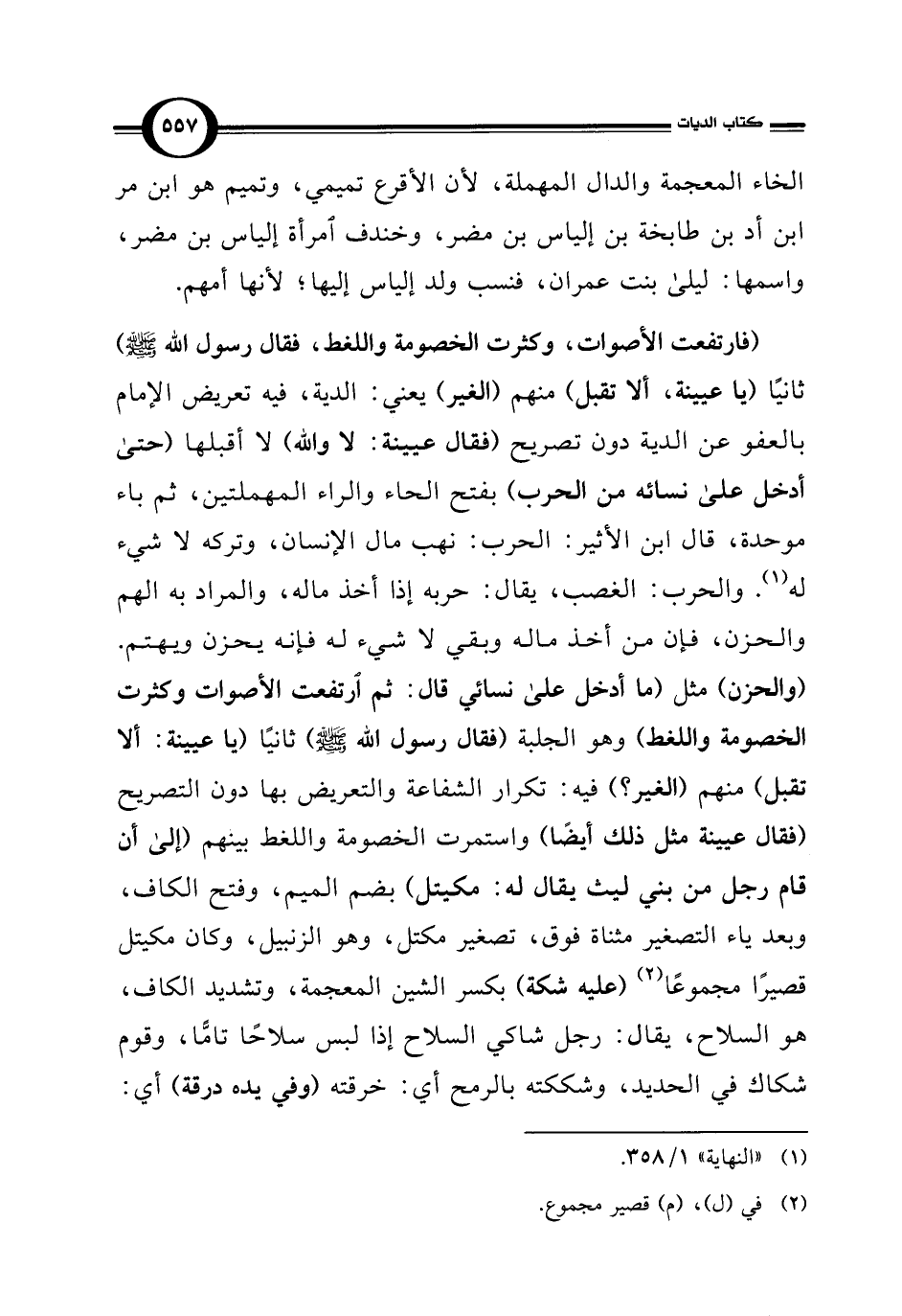 (فارتفعت الأصوات، وكثرت الخصومة واللغط، فقال رسول اللَّه -صلى اللَّه عليه وسلم-) ثانيًا (يا عيينة، ألا تقبل) منهم (الغير) يعني: الدية، فيه تعريض الإمام بالعفو عن الدية دون تصريح (فقال عيينة: لا واللَّه) لا أقبلها (حتى أدخل على نسائه من الحرب) بفتح الحاء والراء المهملتين، ثم باء موحدة، قال ابن الأثير: الحرب: نهب مال الإنسان، وتركه لا شيء له (¬1). والحرب: الغصب، يقال: حربه إذا أخذ ماله، والمراد به الهم والحزن، فإن من أخذ ماله وبقي لا شيء له فإنه يحزن ويهتم. (والحزن) مثل (ما أدخل على نسائي قال: ثم ارتفعت الأصوات وكثرت الخصومة واللغط) وهو الجلبة (فقال رسول اللَّه -صلى اللَّه عليه وسلم-) ثانيًا (يا عيينة: ألا تقبل) منهم (الغير؟ ) فيه: تكرار الشفاعة والتعريض بها دون التصريح (فقال عيينة مثل ذلك أيضًا) واستمرت الخصومة واللغط بينهم (إلى أن قام رجل من بني ليث يقال له: مكيتل) بضم الميم، وفتح الكاف، وبعد ياء التصغير مثناة فوق، تصغير مكتل، وهو الزنبيل، وكان مكيتل قصيرًا مجموعًا (¬2) (عليه شكة) بكسر الشين المعجمة، وتشديد الكاف، هو السلاح، يقال: رجل شاكي السلاح إذا لبس سلاحًا تامًّا، وقوم شكاك في الحديد، وشككته بالرمح أي: خرقته (وفي يده درقة) أي: