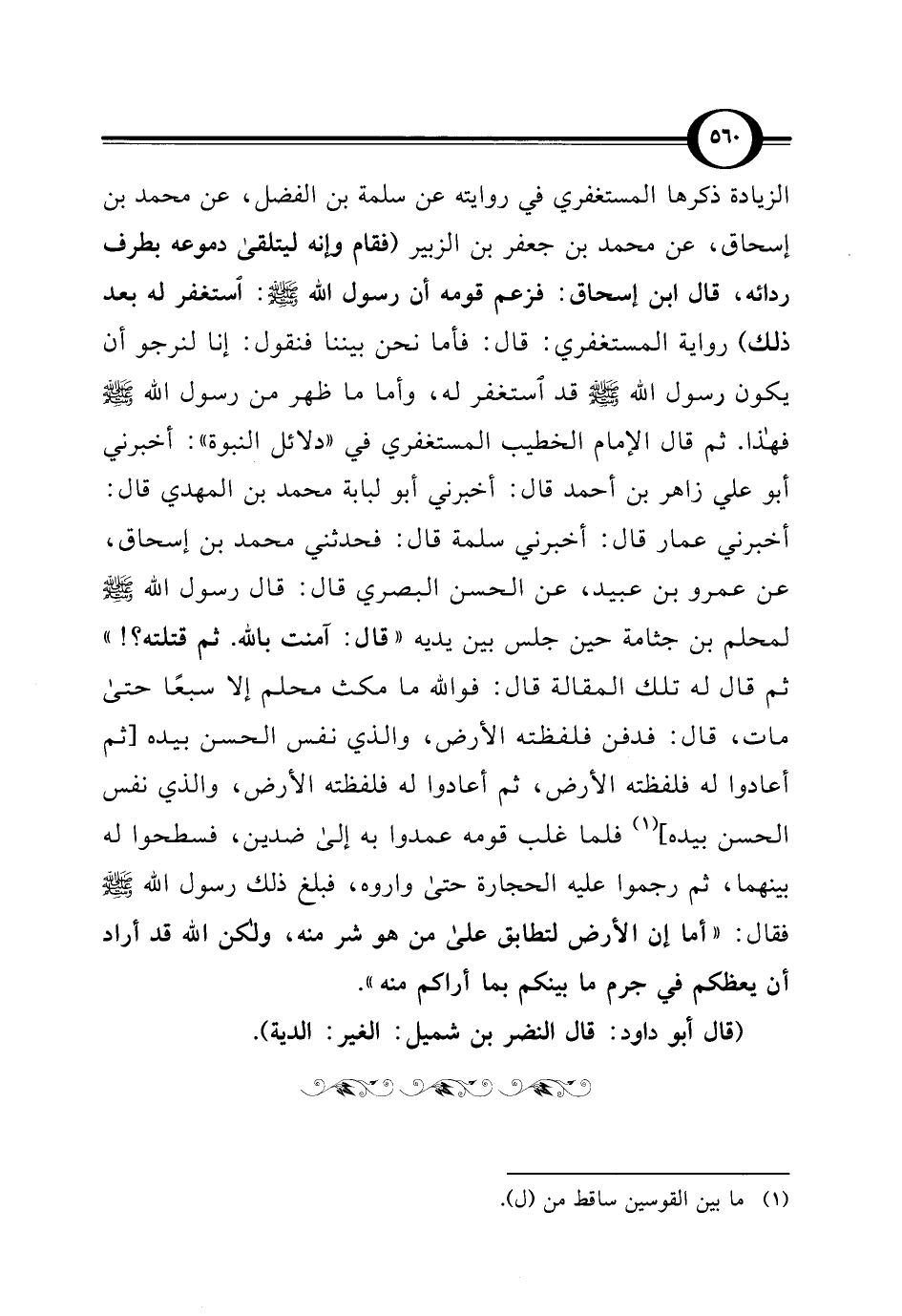 الزيادة ذكرها المستغفري في روايته عن سلمة بن الفضل، عن محمد بن إسحاق، عن محمد بن جعفر بن الزبير (فقام وإنه ليتلقى دموعه بطرف ردائه، قال ابن إسحاق: فزعم قومه أن رسول اللَّه -صلى اللَّه عليه وسلم-: استغفر له بعد ذلك) رواية المستغفري: قال: فأما نحن بيننا فنقول: إنا لنرجو أن يكون رسول اللَّه -صلى اللَّه عليه وسلم- قد استغفر له، وأما ما ظهر من رسول اللَّه -صلى اللَّه عليه وسلم- فهذا. ثم قال الإمام الخطيب المستغفري في "دلائل النبوة": أخبرني أبو علي زاهر بن أحمد قال: أخبرني أبو لبابة محمد بن المهدي قال: أخبرني عمار قال: أخبرني سلمة قال: فحدثني محمد بن إسحاق، عن عمرو بن عبيد، عن الحسن البصري قال: قال رسول اللَّه -صلى اللَّه عليه وسلم- لمحلم بن جثامة حين جلس بين يديه "قال: آمنت باللَّه. ثم قتلته؟ ! " ثم قال له تلك المقالة قال: فواللَّه ما مكث محلم إلا سبعًا حتى مات، قال: فدفن فلفظته الأرض، والذي نفس الحسن بيده [ثم أعادوا له فلفظته الأرض، ثم أعادوا له فلفظته الأرض، والذي نفس الحسن بيده] (¬1) فلما غلب قومه عمدوا به إلى ضدين، فسطحوا له بينهما، ثم رجموا عليه الحجارة حتى واروه، فبلغ ذلك رسول اللَّه -صلى اللَّه عليه وسلم- فقال: "أما إن الأرض لتطابق على من هو شر منه، ولكن اللَّه قد أراد أن يعظكم في جرم ما بينكم بما أراكم منه".