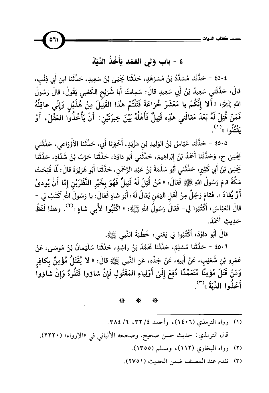 4506 - حَدَّثَنا مُسْلِمٌ، حَدَّثَنا مُحَمَّدُ بْنُ راشِدٍ، حَدَّثَنا سُلَيْمان بْن مُوسَى، عَنْ عَمْرِو بْنِ شُعَيْبٍ، عَنْ أَبِيهِ، عَنْ جَدِّهِ، عَنِ النَّبي -صلى اللَّه عليه وسلم- قالَ: "لا يُقْتَلُ مُؤْمِنٌ بِكافِرٍ وَمَنْ قَتَلَ مُؤْمِنًا مُتَعَمِّدًا دُفِعَ إِلَى أَوْلِياءِ المَقْتُولِ فَإِنْ شاؤوا قَتَلُوهُ وَإِنْ شاؤوا أَخَذُوا الدِّيَةَ" (¬3).