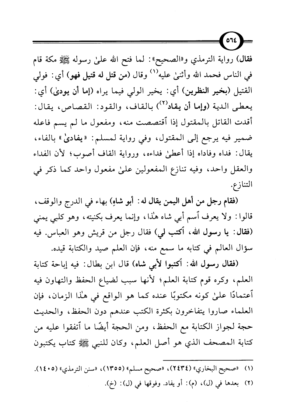 (فقال رسول اللَّه: اكتبوا لأبي شاه) قال ابن بطال: فيه إباحة كتابة العلم، وكره قوم كتابة العلم؛ لأنها سبب لضياع الحفظ والتهاون فيه اعتمادًا على كونه مكتوبًا عنده كما هو الواقع في هذا الزمان، فإن العلماء صاروا يتفاخرون بكثرة الكتب عندهم دون الحفظ، والحديث حجة لجواز الكتابة مع الحفظ، ومن الحجة أيضًا ما اتفقوا عليه من كتابة المصحف الذي هو أصل العلم، وكان للنبي -صلى اللَّه عليه وسلم- كتاب يكتبون