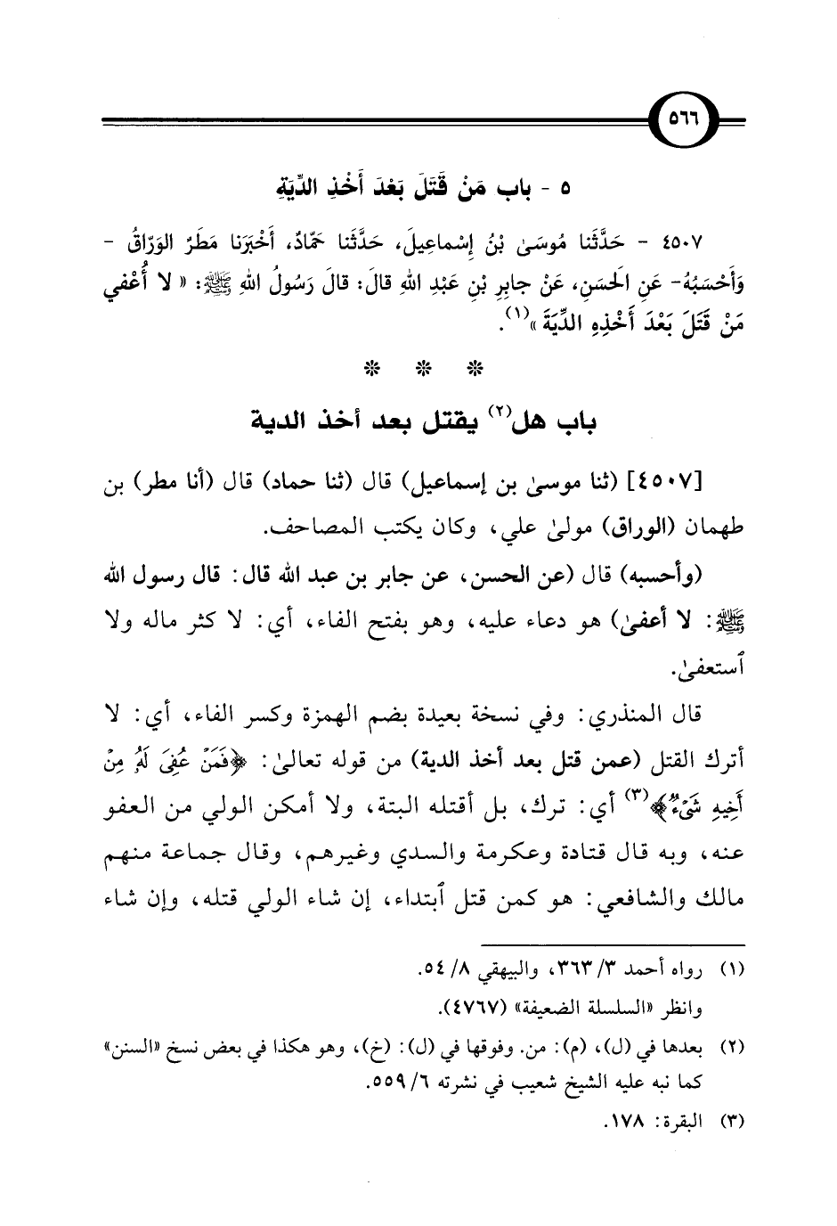 قال المنذري: وفي نسخة بعيدة بضم الهمزة وكسر الفاء، أي: لا أترك القتل (عمن قتل بعد أخذ الدية) من قوله تعالى: {فَمَنْ عُفِيَ لَهُ مِنْ أَخِيهِ شَيْءٌ} (¬3) أي: ترك، بل أقتله البتة، ولا أمكن الولي من العفو عنه، وبه قال قتادة وعكرمة والسدي وغيرهم، وقال جماعة منهم مالك والشافعي: هو كمن قتل ابتداء، إن شاء الولي قتله، وإن شاء
