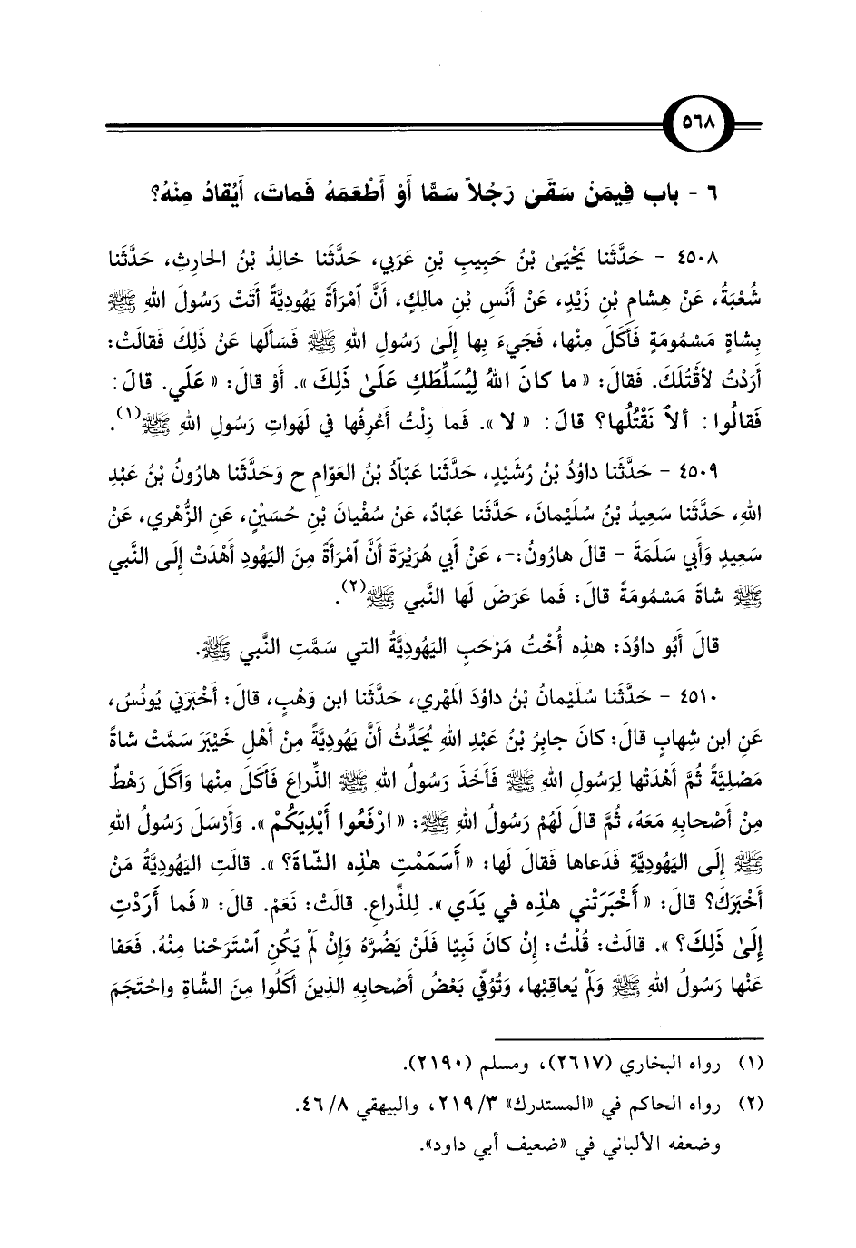4509 - حَدَّثَنا داوُدُ بْنُ رُشَيْدٍ، حَدَّثَنا عَبّاد بْنُ العَوّامِ ح وَحَدَّثَنا هارُون بْنُ عَبْدِ اللَّهِ، حَدَّثَنا سَعِيدُ بْنُ سُلَيْمانَ، حَدَّثَنا عَبّادٌ، عَنْ سُفْيانَ بْنِ حُسَيْنٍ، عَنِ الزُّهْري، عَنْ سَعِيدٍ وَأَبي سَلَمَةَ -قالَ هارُونُ: -، عَنْ أَبي هُرَيْرَةَ أَنَّ امْرَأَةً مِنَ اليَهُودِ أَهْدَتْ إِلَى النَّبي -صلى اللَّه عليه وسلم- شاةً مَسْمُومَةً قالَ: فَما عَرَضَ لَها النَّبي -صلى اللَّه عليه وسلم- (¬2).