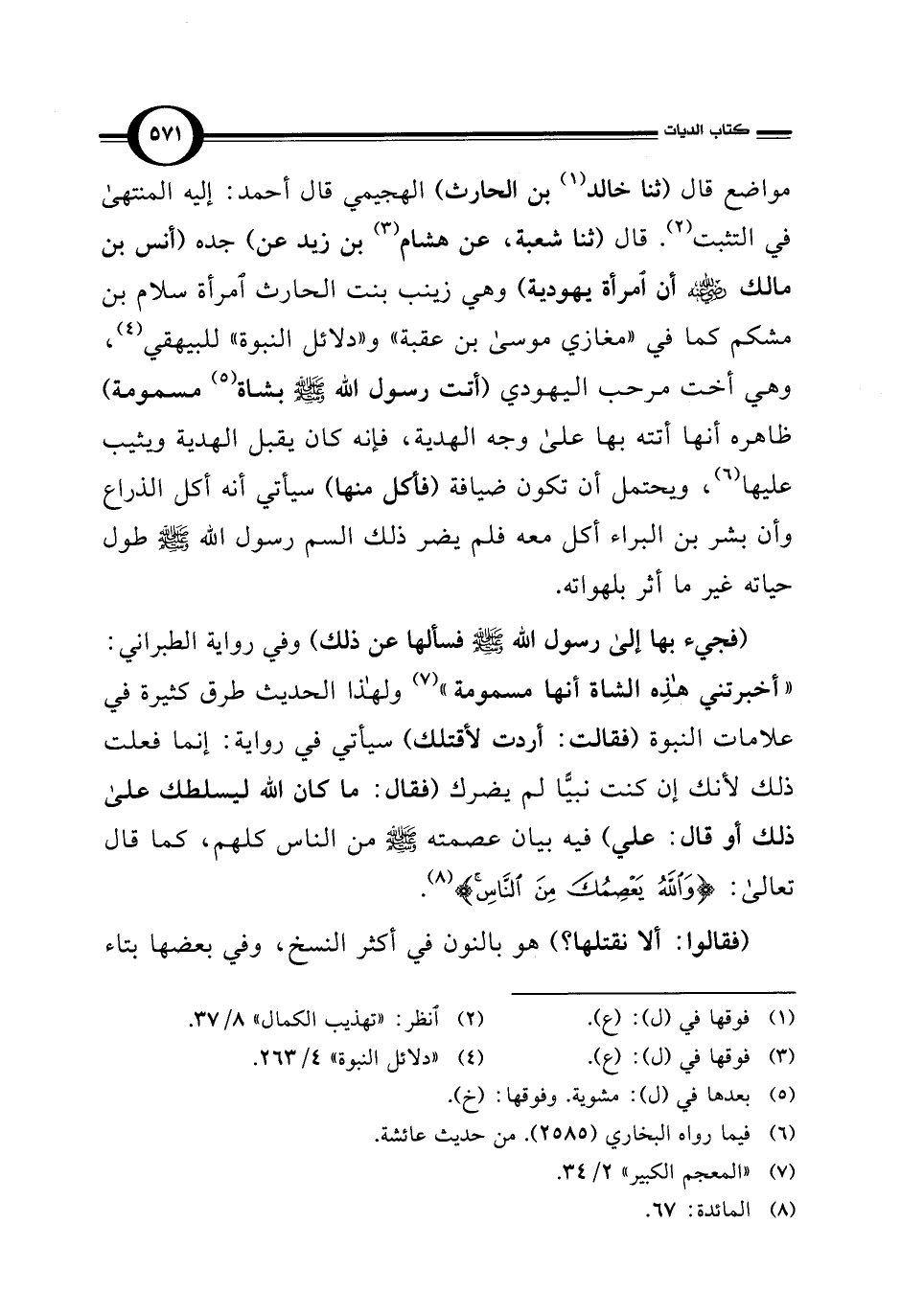 مواضع قال (ثنا خالد (¬1) بن الحارث) الهجيمي قال أحمد: إليه المنتهي في التثبت (¬2). قال (ثنا شعبة، عن هشام (¬3) بن زيد عن) جده (أنس بن مالك -رضي اللَّه عنه- أن امرأة يهودية) وهي زينب بنت الحارث امرأة سلام بن مشكم كما في "مغازي موسى بن عقبة" و"دلائل النبوة" للبيهقي (¬4)، وهي أخت مرحب اليهودي (أتت رسول اللَّه -صلى اللَّه عليه وسلم- بشاة (¬5) مسمومة) ظاهره أنها أتته بها على وجه الهدية، فإنه كان يقبل الهدية ويثيب عليها (¬6)، ويحتمل أن تكون ضيافة (فأكل منها) سيأتي أنه أكل الذراع وأن بشر بن البراء أكل معه فلم يضر ذلك السم رسول اللَّه -صلى اللَّه عليه وسلم- طول حياته غير ما أثر بلهواته.