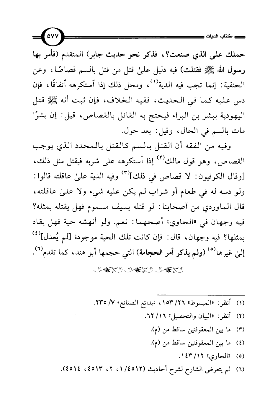 وفيه من الفقه أن القتل بالسم كالقتل بالمحدد الذي يوجب القصاص، وهو قول مالك (¬2) إذا استكرهه على شربه فيقتل مثل ذلك، [وقال الكوفيون: لا قصاص في ذلك] (¬3) وفيه الدية على عاقلته قالوا: ولو دسه له في طعام أو شراب لم يكن عليه شيء ولا على عاقلته، قال الماوردي من أصحابنا: لو قتله بسيف مسموم فهل يقتله بمثله؟ فيه وجهان في "الحاوي" أصحهما: نعم. ولو أنهشه حية فهل يقاد بمثلها؟ فيه وجهان، قال: فإن كانت تلك الحية موجودة [لم يُعدل] (¬4) إلى غيرها (¬5) (ولم يذكر أمر الحجامة) التي حجمها أبو هند، كما تقدم (¬6).
