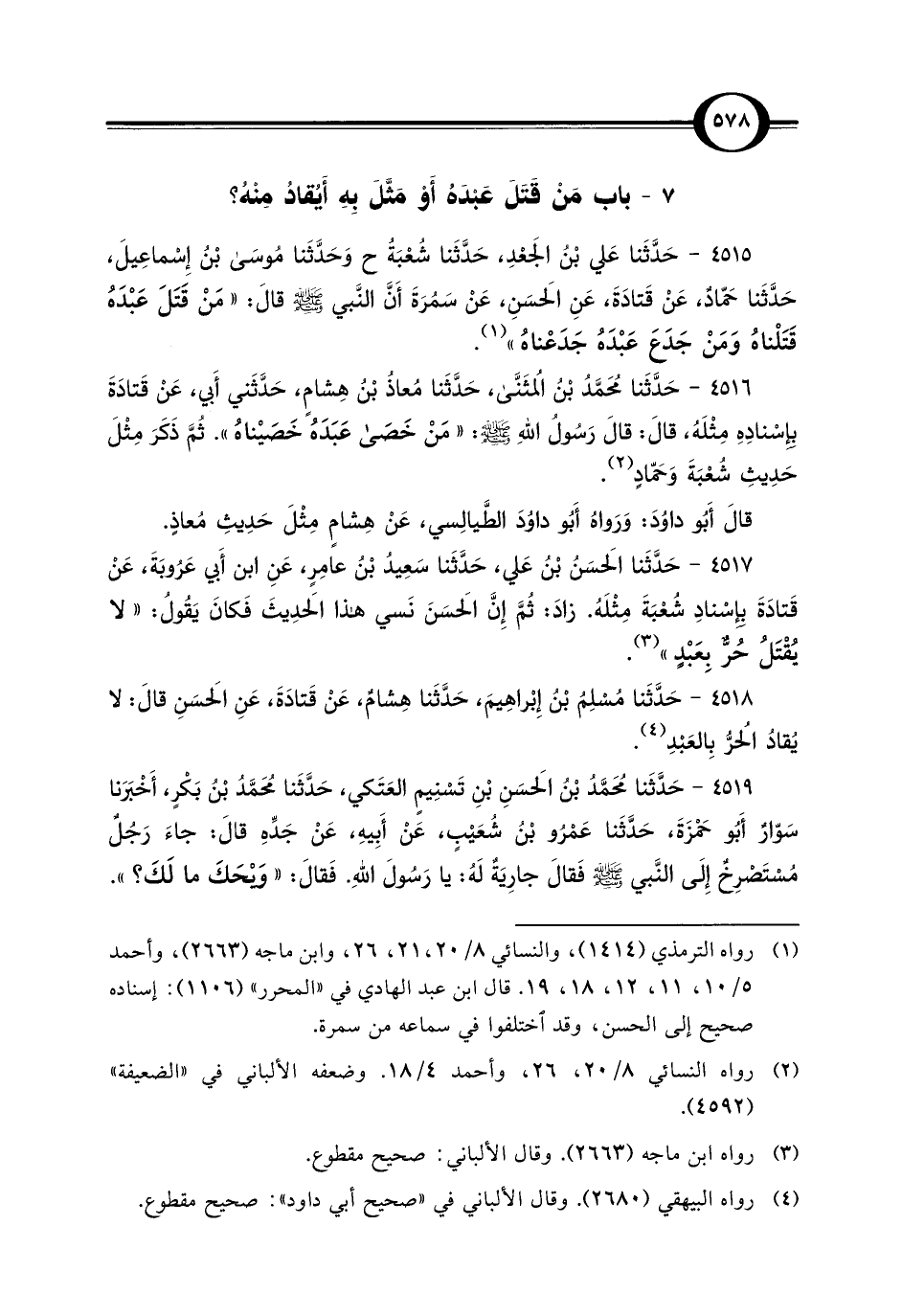 4515 - حَدَّثَنا عَلي بْنُ الجَعْدِ، حَدَّثَنا شُعْبَةُ ح وَحَدَّثَنا مُوسَى بْنُ إِسْماعِيلَ، حَدَّثَنا حَمّادٌ، عَنْ قَتادَةَ، عَنِ الحَسَنِ، عَنْ سَمُرَةَ أَنَّ النَّبي -صلى اللَّه عليه وسلم- قالَ: "مَنْ قَتَلَ عَبْدَهُ قَتَلْناهُ وَمَنْ جَدَعَ عَبْدَهُ جَدَعْناهُ" (¬1).