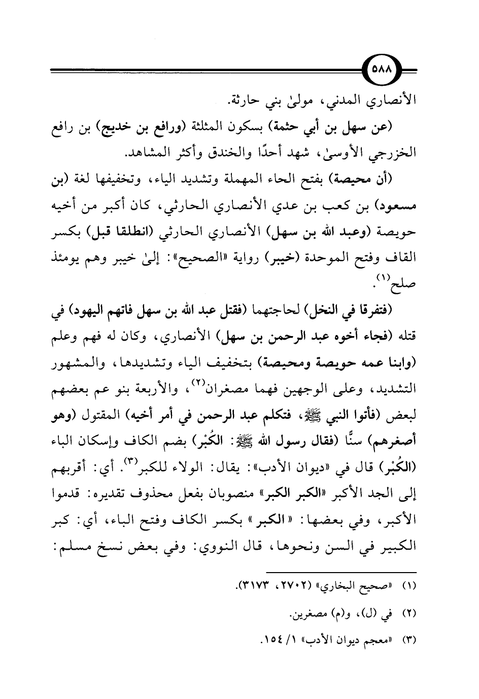 (فتفرقا في النخل) لحاجتهما (فقتل عبد اللَّه بن سهل فاتهم اليهود) في قتله (فجاء أخوه عبد الرحمن بن سهل) الأنصاري، وكان له فهم وعلم (وابنا عمه حويصة ومحيصة) بتخفيف الياء وتشديدها، والمشهور التشديد، وعلى الوجهين فهما مصغران (¬2)، والأربعة بنو عم بعضهم لبعض (فأتوا النبي -صلى اللَّه عليه وسلم-، فتكلم عبد الرحمن في أمر أخيه) المقتول (وهو أصغرهم) سنًّا (فقال رسول اللَّه -صلى اللَّه عليه وسلم-: الكُبْر) بضم الكاف وإسكان الباء (الكُبْر) قال في "ديوان الأدب ": يقال: الولاء للكبر (¬3). أي: أقربهم إلى الجد الأكبر "الكبر الكبر" منصوبان بفعل محذوف تقديره: قدموا الأكبر، وفي بعضها: "الكبر" بكسر الكاف وفتح الباء، أي: كبر الكبير في السن ونحوها، قال النووي: وفي بعض نسخ مسلم: