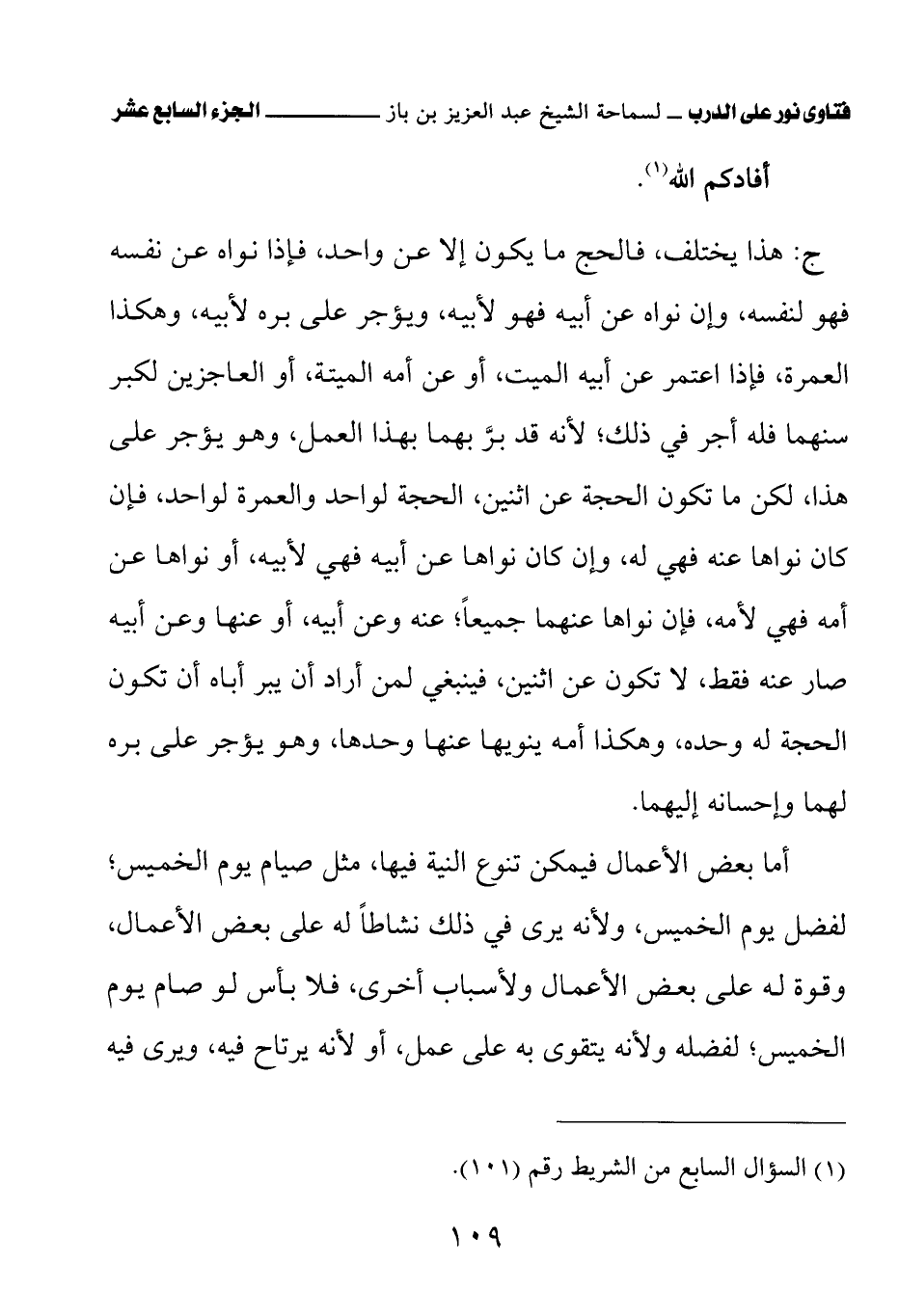 ج: هذا يختلف، فالحج ما يكون إلا عن واحد، فإذا نواه عن نفسه فهو لنفسه، وإن نواه عن أبيه فهو لأبيه، ويؤجر على بره لأبيه، وهكذا العمرة، فإذا اعتمر عن أبيه الميت، أو عن أمه الميتة، أو العاجزين لكبر سنهما فله أجر في ذلك؛ لأنه قد برَّ بهما بهذا العمل، وهو يؤجر على هذا، لكن ما تكون الحجة عن اثنين، الحجة لواحد والعمرة لواحد، فإن كان نواها عنه فهي له، وإن كان نواها عن أبيه فهي لأبيه، أو نواها عن أمه فهي لأمه، فإن نواها عنهما جميعًا؛ عنه وعن أبيه، أو عنها وعن أبيه صار عنه فقط، لا تكون عن اثنين، فينبغي لمن أراد أن يبر أباه أن تكون الحجة له وحده، وهكذا أمه ينويها عنها وحدها، وهو يؤجر على بره لهما وإحسانه إليهما.