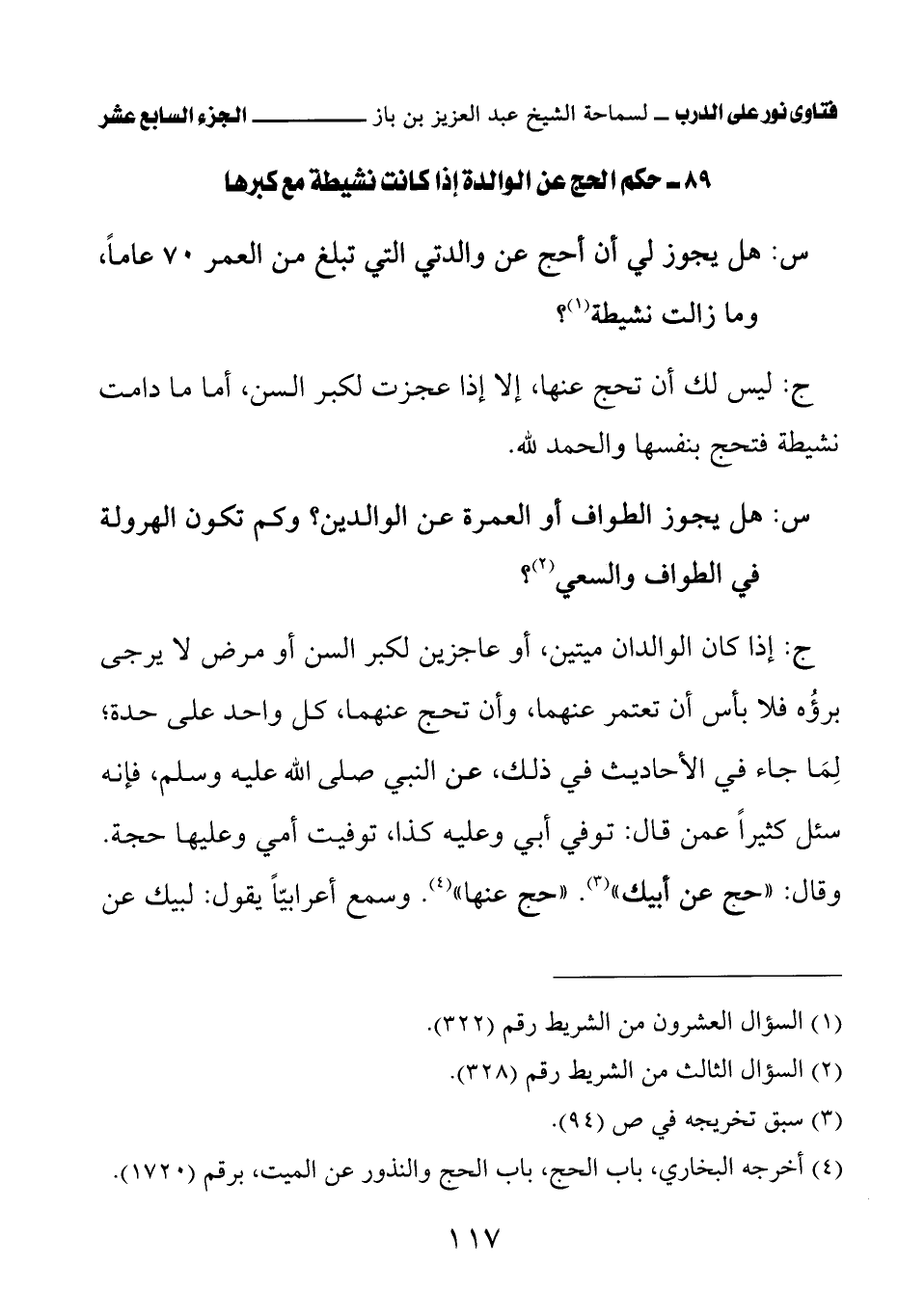 ج: إذا كان الوالدان ميتين، أو عاجزين لكبر السن أو مرض لا يرجى برؤُه فلا بأس أن تعتمر عنهما، وأن تحج عنهما، كل واحد على حدة؛ لِمَا جاء في الأحاديث في ذلك، عن النبي صلى الله عليه وسلم، فإنه سئل كثيرًا عمن قال: توفي أبي وعليه كذا، توفيت أمي وعليها حجة. وقال: «حج عن أبيك» (¬3) «حج عنها» (¬4) وسمع أعرابيًّا يقول: «لبيك عن