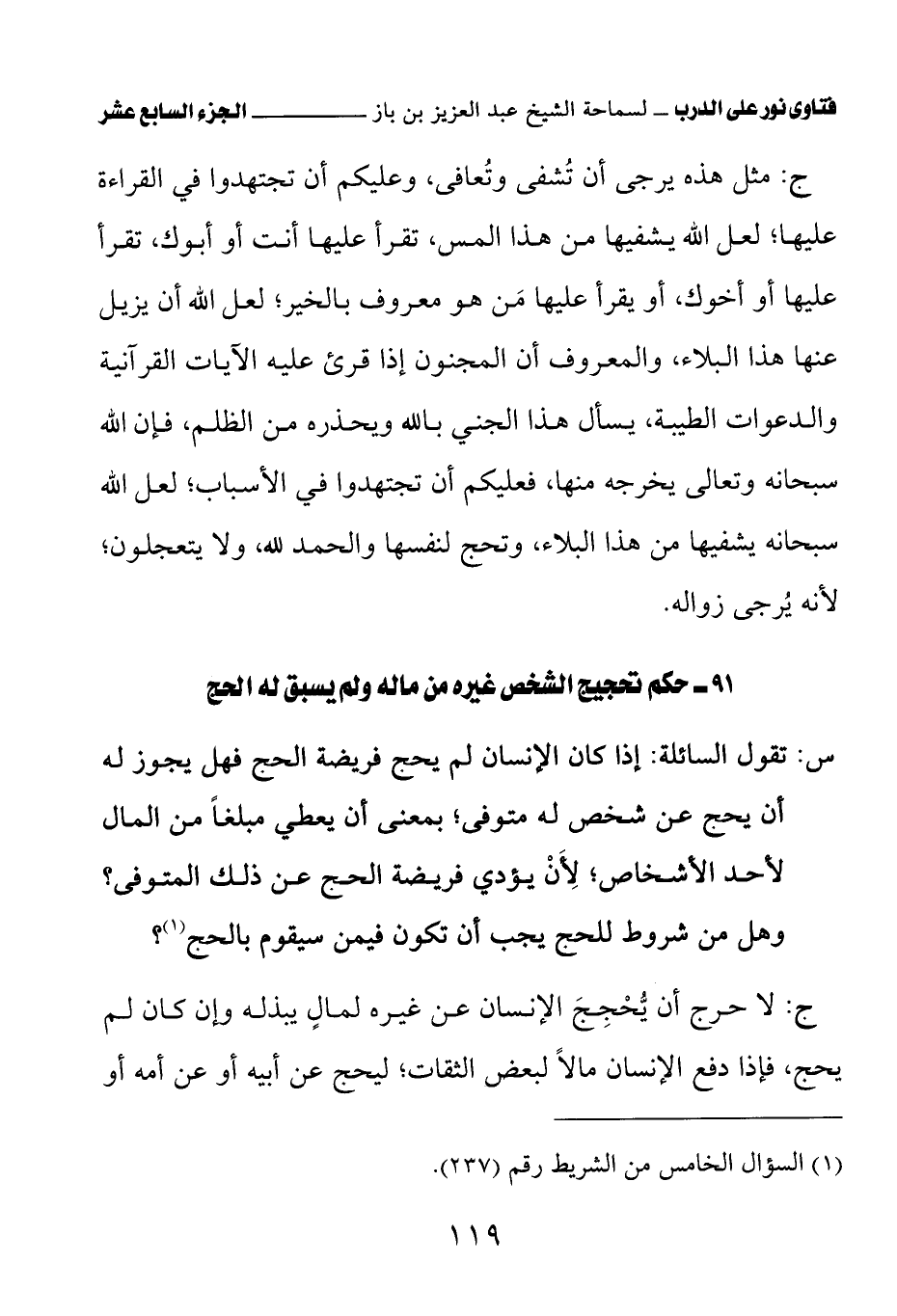 ج: مثل هذه يرجى أن تُشفى وتُعافى، وعليكم أن تجتهدوا في القراءة عليها؛ لعل الله يشفيها من هذا المس، تقرأ عليها أنت أو أبوك، تقرأ عليها أو أخوك، أو يقرأ عليها مَن هو معروف بالخير؛ لعل الله أن يزيل عنها هذا البلاء، والمعروف أن المجنون إذا قرئ عليه الآيات القرآنية والدعوات الطيبة، يسأل هذا الجني بالله ويحذره من الظلم، فإن الله سبحانه وتعالى يخرجه منها، فعليكم أن تجتهدوا في الأسباب؛ لعل الله سبحانه يشفيها من هذا البلاء، وتحج لنفسها والحمد لله، ولا يتعجلون؛ لأنه يُرجى زواله.