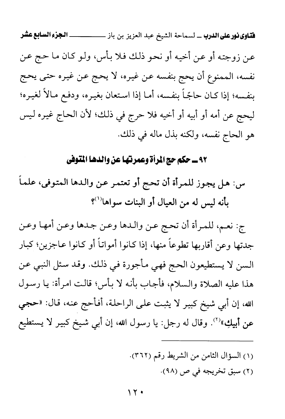 ج: نعم، للمرأة أن تحج عن والدها وعن جدها وعن أمها وعن جدتها وعن أقاربها تطوعًا منها، إذا كانوا أمواتًا أو كانوا عاجزين؛ كبار السن لا يستطيعون الحج فهي مأجورة في ذلك. وقد سئل النبي عن هذا عليه الصلاة والسلام، فأجاب بأنه لا بأس؛ قالت امرأة: «يا رسول الله، إن أبي شيخ كبير لا يثبت على الراحلة، أفاحج عنه، قال: حجي عن أبيكِ» (¬3) وقال له رجل: «يا رسول الله، إن أبي شيخ كبير لا يستطيع