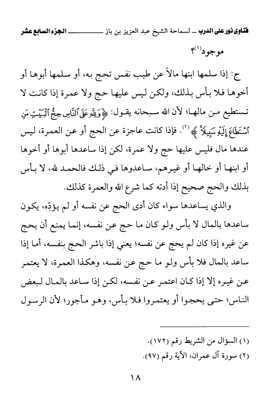 والذي يساعدها سواء كان أدى الحج عن نفسه أو لم يؤدِّه، يكون ساعدها بالمال لا بأس ولو كان ما حج عن نفسه، إنما يمنع أن يحج عن غيره إذا كان لم يحج عن نفسه؛ يعني إذا باشر الحج بنفسه، أما إذا ساعد بالمال فلا بأس ولو ما حج عن نفسه، وهكذا العمرة، لا يعتمر عن غيره إلا إذا كان اعتمر عن نفسه، لكن إذا ساعد بالمال لبعض الناس؛ حتى يحجوا أو يعتمروا فلا بأس، وهو مأجور؛ لأن الرسول