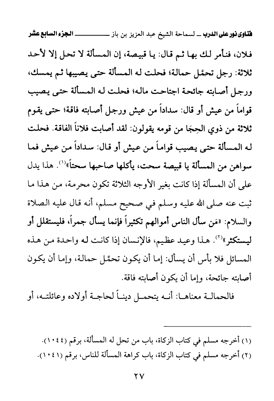 (¬1) أخرجه مسلم في كتاب الزكاة، باب من تحل له المسألة، برقم (1044).