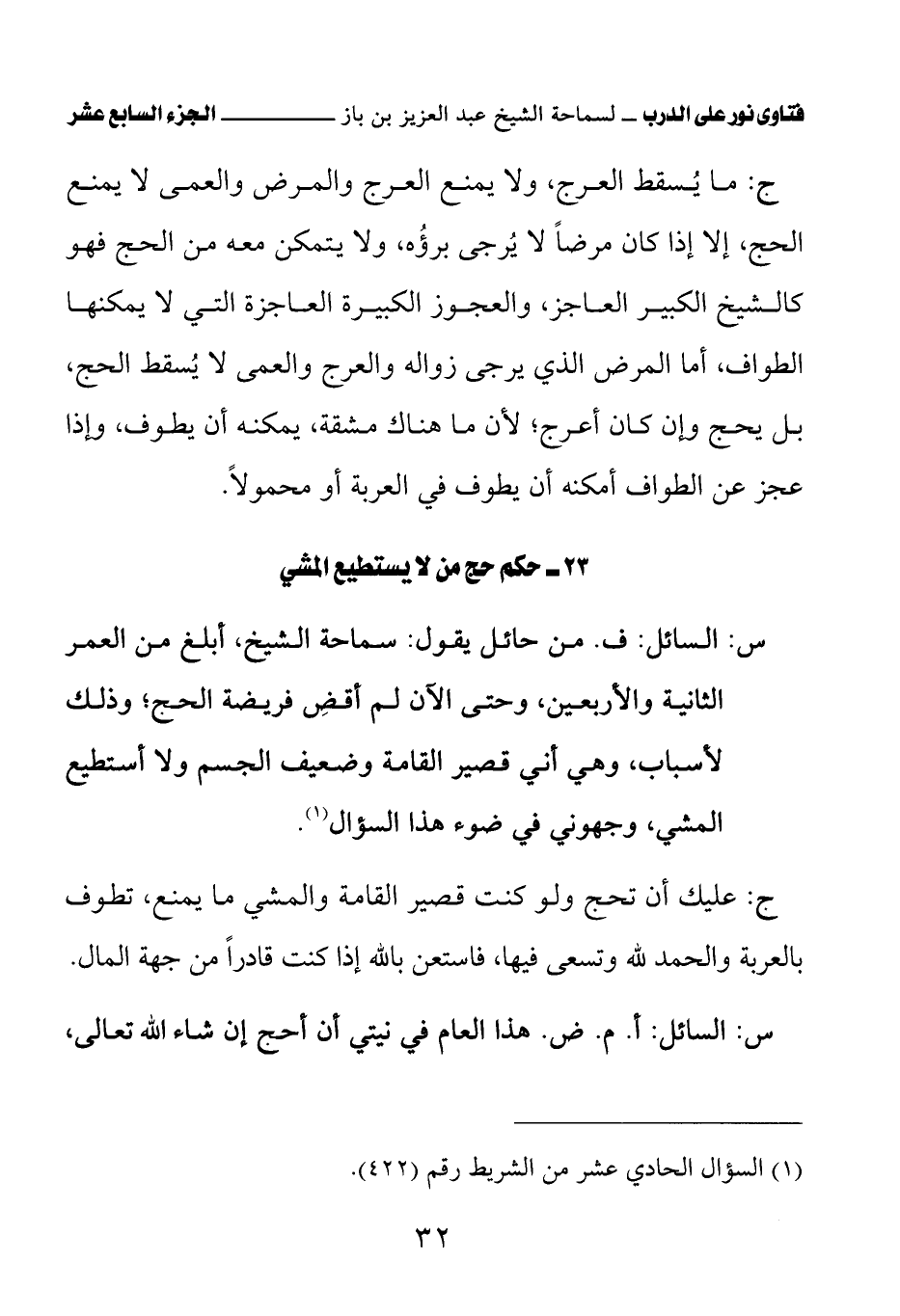 ج: ما يُسقط العرج، ولا يمنع العرج والمرض والعمى لا يمنع الحج، إلا إذا كان مرضًا لا يُرجى برؤُه، ولا يتمكن معه من الحج فهو كالشيخ الكبير العاجز، والعجوز الكبيرة العاجزة التي لا يمكنها الطواف، أما المرض الذي يرجى زواله والعرج والعمى لا يُسقط الحج، بل يحج وإن كان أعرج؛ لأن ما هناك مشقة، يمكنه أن يطوف، وإذا عجز عن الطواف أمكنه أن يطوف في العربة أو محمولاً.
