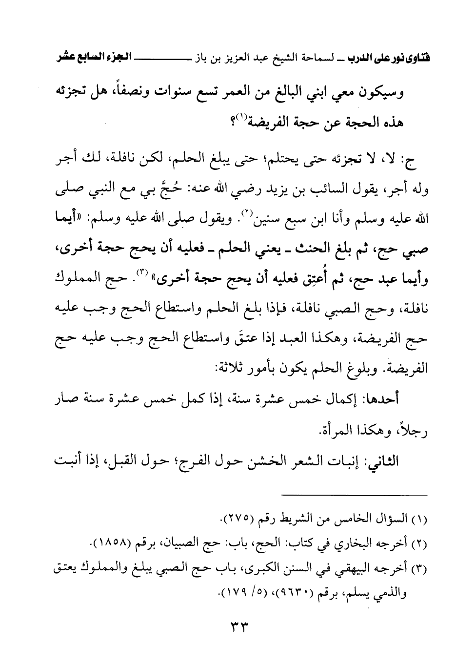 ج: لا، لا تجزئه حتى يحتلم؛ حتى يبلغ الحلم، لكن نافلة، لك أجر وله أجر، يقول السائب بن يزيد رضي الله عنه: «حُجَّ بي مع النبي صلى الله عليه وسلم وأنا ابن سبع سنين» (¬1). ويقول صلى الله عليه وسلم: «أيما صبي حج، ثم بلغ الحنث – يعني الحلم - فعليه أن يحج حجة أخرى، وأيما عبد حج، ثم أُعتِق فعليه أن يحج حجة أخرى» (¬2). حج المملوك نافلة، وحج الصبي نافلة، فإذا بلغ الحلم واستطاع الحج وجب عليه حج الفريضة، وهكذا العبد إذا عتقَ واستطاع الحج وجب عليه حج الفريضة. وبلوغ الحلم يكون بأمور ثلاثة: