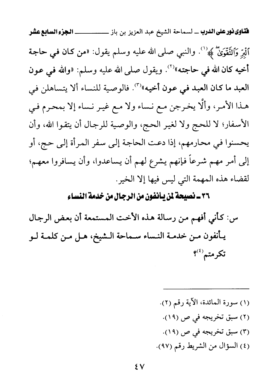 والنبي صلى الله عليه وسلم يقول: «من كان في حاجة أخيه كان الله في حاجته» (¬1) ويقول صلى الله عليه وسلم: «والله في عون العبد ما كان العبد في عون أخيه» (¬2) فالوصية للنساء ألا يتساهلن في هذا الأمر، وألاَّ يخرجن مع نساء ولا مع غير نساء إلا بمحرم في الأسفار؛ لا للحج ولا لغير الحج، والوصية للرجال أن يتقوا الله، وأن يحسنوا في محارمهم، إذا دعت الحاجة إلى سفر المرأة إلى حج، أو إلى أمر مهم شرعًا فإنهم يشرع لهم أن يساعدوا، وأن يسافروا معهم؛ لقضاء هذه المهمة التي ليس فيها إلا الخير.
