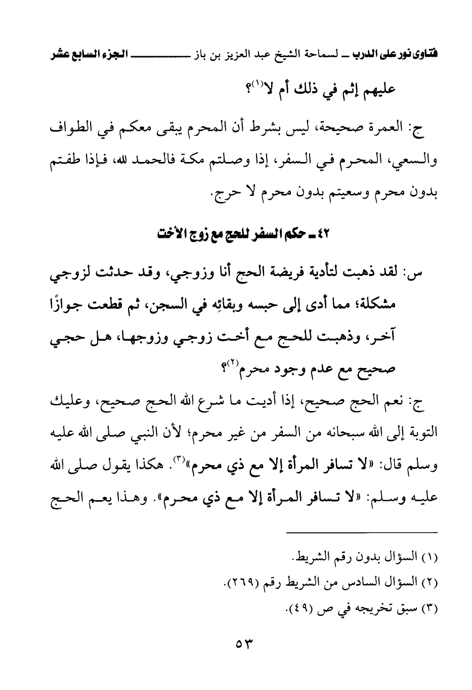 ج: نعم الحج صحيح، إذا أديت ما شرع الله الحج صحيح، وعليك التوبة إلى الله سبحانه من السفر من غير محرم؛ لأن النبي صلى الله عليه وسلم قال: «لا تسافر المرأة إلا مع ذي محرم» (¬2) هكذا يقول صلى الله عليه وسلم: «لا تسافر المرأة إلا مع ذي محرم» (¬3). وهذا يعم الحج