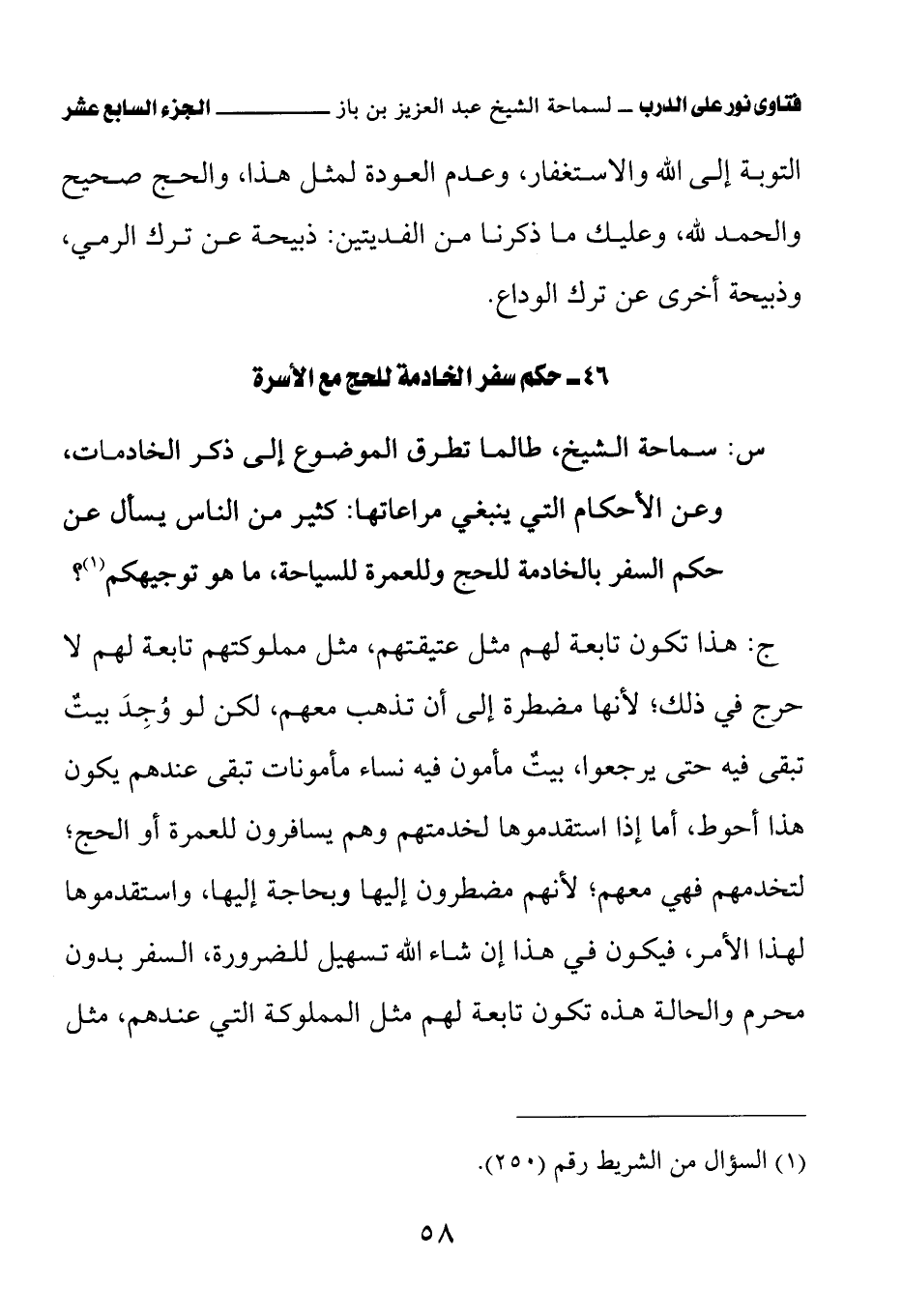 س: سماحة الشيخ، طالما تطرق الموضوع إلى ذكر الخادمات، وعن الأحكام التي ينبغي مراعاتها: كثير من الناس يسأل عن حكم السفر بالخادمة للحج وللعمرة للسياحة، ما هو توجيهكم (¬1)؟