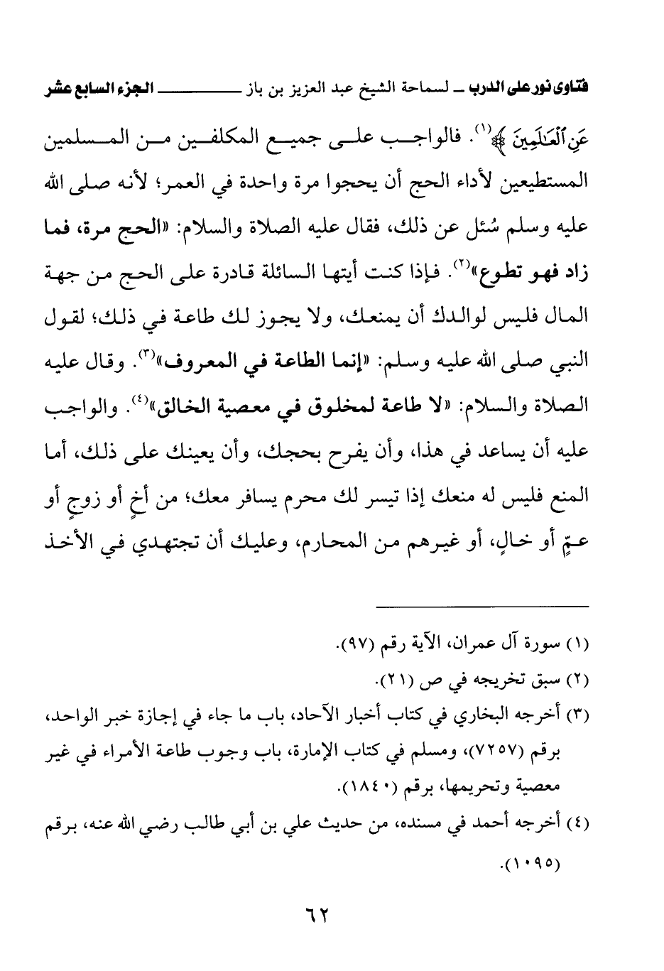 فالواجب على جميع المكلفين من المسلمين المستطيعين لأداء الحج أن يحجوا مرة واحدة في العمر؛ لأنه صلى الله عليه وسلم سُئل عن ذلك، فقال عليه الصلاة والسلام: «الحج مرة، فما زاد فهو تطوع» (¬1) فإذا كنت أيتها السائلة قادرة على الحج من جهة المال فليس لوالدك أن يمنعك، ولا يجوز لك طاعة في ذلك؛ لقول النبي صلى الله عليه وسلم: «إنما الطاعة في المعروف» (¬2) وقال عليه الصلاة والسلام: «لا طاعة لمخلوق في معصية الخالق» (¬3) والواجب عليه أن يساعد في هذا، وأن يفرح بحجك، وأن يعينك على ذلك، أما المنع فليس له منعك إذا تيسر لك محرم يسافر معك؛ من أخٍ أو زوجٍ أو عمٍّ أو خالٍ، أو غيرهم من المحارم، وعليك أن تجتهدي في الأخذ