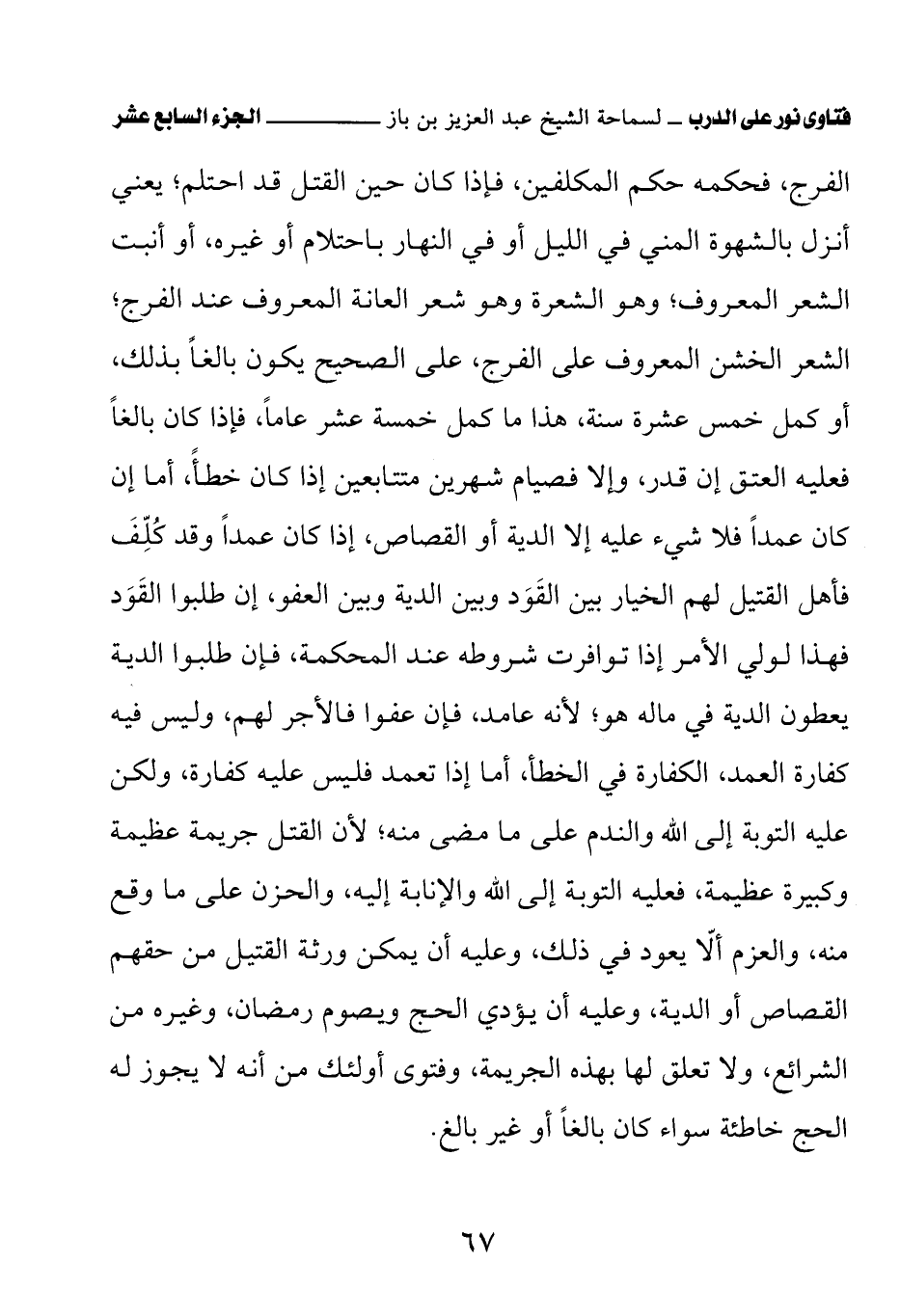 الفرج، فحكمه حكم المكلفين، فإذا كان حين القتل قد احتلم؛ يعني أنزل بالشهوة المني في الليل أو في النهار باحتلام أو غيره، أو أنبت الشعر المعروف؛ وهو الشعرة وهو شعر العانة المعروف عند الفرج؛ الشعر الخشن المعروف على الفرج، على الصحيح يكون بالغًا بذلك، أو كمل خمس عشرة سنة، هذا ما كمل خمسة عشر عامًا، فإذا كان بالغًا فعليه العتق إن قدر، وإلا فصيام شهرين متتابعين إذا كان خطأ، أما إن كان عمدًا فلا شيء عليه إلا الدية أو القصاص، إذا كان عمدًا وقد كُلِّفَ فأهل القتيل لهم الخيار بين القَوَد وبين الدية وبين العفو، إن طلبوا القَوَد فهذا لولي الأمر إذا توافرت شروطه عند المحكمة، فإن طلبوا الدية يعطون الدية في ماله هو؛ لأنه عامد، فإن عفوا فالأجر لهم، وليس فيه كفارة العمد، الكفارة في الخطأ، أما إذا تعمد فليس عليه كفارة، ولكن عليه التوبة إلى الله والندم على ما مضى منه؛ لأن القتل جريمة عظيمة وكبيرة عظيمة، فعليه التوبة إلى الله والإنابة إليه، والحزن على ما وقع منه، والعزم ألاّ يعود في ذلك، وعليه أن يمكن ورثة القتيل من حقهم القصاص أو الدية، وعليه أن يؤدي الحج ويصوم رمضان، وغيره من الشرائع، ولا تعلق لها بهذه الجريمة، وفتوى أولئك من أنه لا يجوز له الحج خاطئة سواء كان بالغًا أو غير بالغ.
