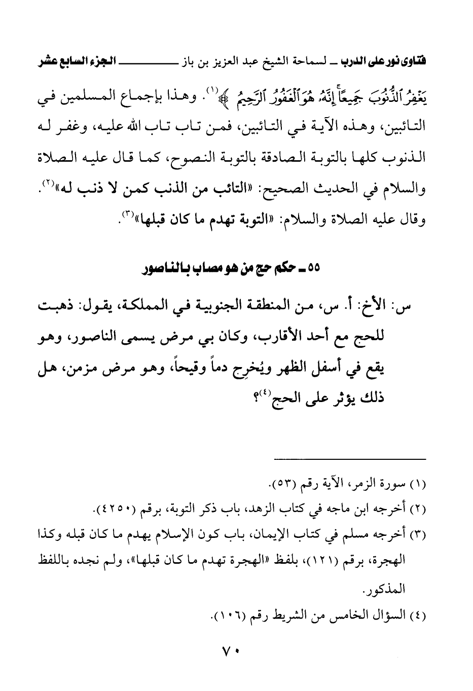 س: الأخ: أ. س، من المنطقة الجنوبية في المملكة، يقول: ذهبت للحج مع أحد الأقارب، وكان بي مرض يسمى الناصور، وهو يقع في أسفل الظهر ويُخرِج دمًا وقيحًا، وهو مرض مزمن، هل ذلك يؤثر على الحج (¬1)؟