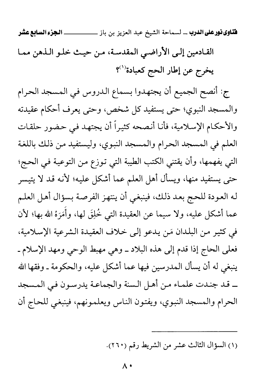 ج: أنصح الجميع أن يجتهدوا في سماع الدروس في المسجد الحرام والمسجد النبوي؛ حتى يستفيد كل شخص، وحتى يعرف أحكام عقيدته والأحكام الإسلامية، فأنا أنصحه كثيرًا أن يجتهد في حضور حلقات العلم في المسجد الحرام والمسجد النبوي، وليستفيد من ذلك باللغة التي يفهمها، وأن يقتني الكتب الطيبة التي توزع من التوعية في الحج؛ حتى يستفيد منها، ويسأل أهل العلم عما أشكل عليه؛ لأنه قد لا يتيسر له العودة للحج بعد ذلك، فينبغي أن ينتهز الفرصة بسؤال أهل العلم عما أشكل عليه، ولا سيما عن العقيدة التي خُلِقَ لها، وأَمَرَهُ الله بها؛ لأن في كثير من البلدان مَن يدعو إلى خلاف العقيدة الشرعية الإسلامية، فعلى الحاج إذا قدم إلى هذه البلاد - وهي مهبط الوحي ومهد الإسلام - ينبغي له أن يسأل المدرسين فيها عما أشكل عليه، والحكومة - وفقها الله - قد جندت علماء من أهل السنة والجماعة يدرسون في المسجد الحرام والمسجد النبوي، ويفتون الناس ويعلمونهم، فينبغي للحاج أن