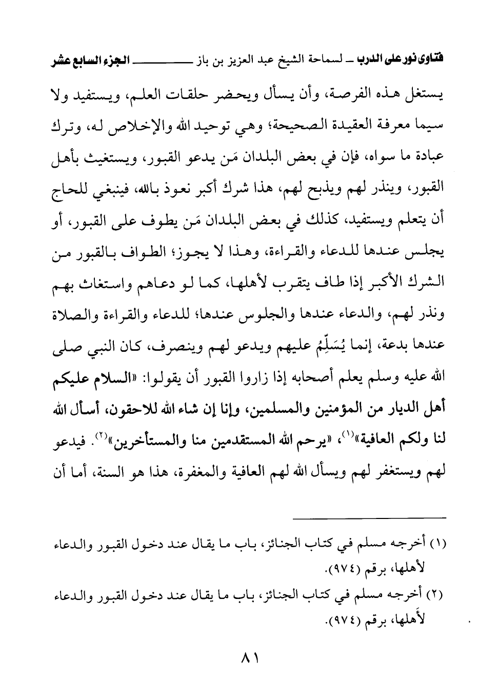يستغل هذه الفرصة، وأن يسأل ويحضر حلقات العلم، ويستفيد ولا سيما معرفة العقيدة الصحيحة؛ وهي توحيد الله والإخلاص له، وترك عبادة ما سواه، فإن في بعض البلدان مَن يدعو القبور، ويستغيث بأهل القبور، وينذر لهم ويذبح لهم، هذا شرك أكبر نعوذ بالله، فينبغي للحاج أن يتعلم ويستفيد، كذلك في بعض البلدان مَن يطوف على القبور، أو يجلس عندها للدعاء والقراءة، وهذا لا يجوز؛ الطواف بالقبور من الشرك الأكبر إذا طاف يتقرب لأهلها، كما لو دعاهم واستغاث بهم ونذر لهم، والدعاء عندها والجلوس عندها؛ للدعاء والقراءة والصلاة عندها بدعة، إنما يُسَلِّمُ عليهم ويدعو لهم وينصرف، كان النبي صلى الله عليه وسلم يعلم أصحابه إذا زاروا القبور أن يقولوا: «السلام عليكم أهل الديار من المؤمنين والمسلمين، وإنا إن شاء الله للاحقون، أسأل الله لنا ولكم العافية» (¬1) «يرحم الله المستقدمين منا والمستأخرين» (¬2) فيدعو لهم ويستغفر لهم ويسأل الله لهم العافية والمغفرة، هذا هو السنة، أما أن