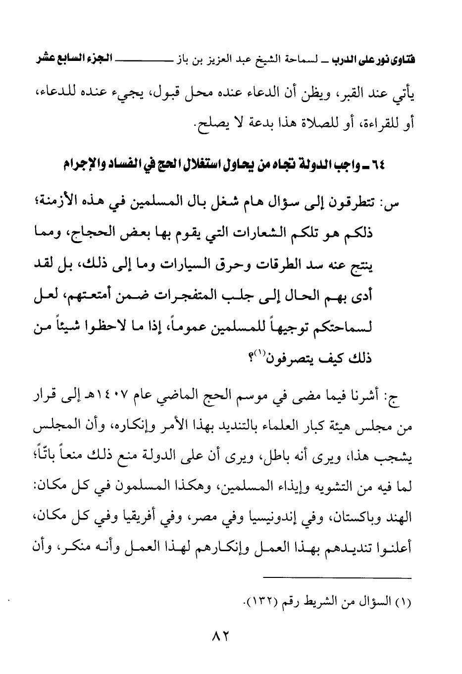 ج: أشرنا فيما مضى في موسم الحج الماضي عام 1407 هـ إلى قرار من مجلس هيئة كبار العلماء بالتنديد بهذا الأمر وإنكاره، وأن المجلس يشجب هذا، ويرى أنه باطل، ونرى أن على الدولة منع ذلك منعًا باتًّا؛ لما فيه من التشويه وإيذاء المسلمين، وهكذا المسلمون في كل مكان: الهند وباكستان، وفي إندونيسيا وفي مصر، وفي أفريقيا وفي كل مكان، أعلنوا تنديدهم بهذا العمل وإنكارهم لهذا العمل وأنه منكر، وأن