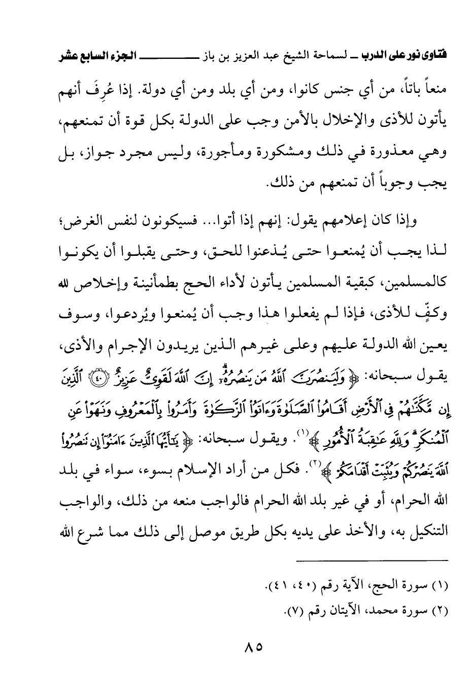 وإذا كان إعلامهم يقول: إنهم إذا أتوا ... فسيكونون بنفس الغرض؛ لذا يجب أن يُمنعوا حتى يُذعنوا للحق، وحتى يقبلوا أن يكونوا كالمسلمين، كبقية المسلمين يأتون لأداء الحج بطمأنينة وإخلاص لله وكفٍّ للأذى، فإذا لم يفعلوا هذا وجب أن يُمنعوا ويُردعوا، وسوف يعين الله الدولة عليهم وعلى غيرهم الذين يريدون الإجرام والأذى، يقول سبحانه: {وَلَيَنْصُرَنَّ اللَّهُ مَنْ يَنْصُرُهُ إِنَّ اللَّهَ لَقَوِيٌّ عَزِيزٌ (40) الَّذِينَ إِنْ مَكَّنَّاهُمْ فِي الْأَرْضِ أَقَامُوا الصَّلاَةَ وَآتَوُا الزَّكَاةَ وَأَمَرُوا بِالْمَعْرُوفِ وَنَهَوْا عَنِ الْمُنْكَرِ وَلِلَّهِ عَاقِبَةُ الْأُمُورِ}. ويقول سبحانه: {يَاأَيُّهَا الَّذِينَ آمَنُوا إِنْ تَنْصُرُوا اللَّهَ يَنْصُرْكُمْ وَيُثَبِّتْ أَقْدَامَكُمْ}. فكل من أراد الإسلام بسوء، سواء في بلد الله الحرام، أو في غير بلد الله الحرام فالواجب منعه من ذلك، والواجب التنكيل به، والأخذ على يديه بكل طريق موصل إلى ذلك مما شرع الله