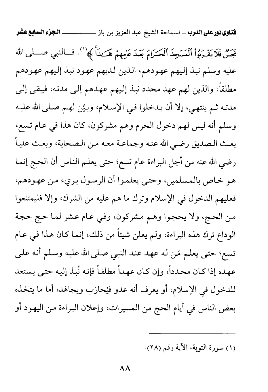 {يَاأَيُّهَا الَّذِينَ آمَنُوا إِنَّمَا الْمُشْرِكُونَ نَجَسٌ فَلاَ يَقْرَبُوا الْمَسْجِدَ الْحَرَامَ بَعْدَ عَامِهِمْ هَذَا}. فالنبي صلى الله عليه وسلم نبذ إليهم عهودهم، الذين لديهم عهود نبذ إليهم عهودهم مطلقًا، والذين لهم عهد محدد نبذ إليهم عهدهم إلى مدته، فيبقى إلى مدته ثم ينتهي، إلا أن يدخلوا في الإسلام، وبيَّن لهم صلى الله عليه وسلم أنه ليس لهم دخول الحرم، وهم مشركون، كان هذا في عام تسع، بعث الصديق رضي الله عنه وجماعة معه من الصحابة، وبعث عليًا رضي الله عنه من أجل البراءة عام تسع؛ حتى يعلم الناس أن الحج إنما هو خاص بالمسلمين، وحتى يعلموا أن الرسول بريء من عهودهم، فعليهم الدخول في الإسلام وترك ما هم عليه من الشرك، وإلا فليمتنعوا من الحج، ولا يحجوا وهم مشركون، وفي عام عشر لما حج حجة الوداع ترك هذه البراءة، ولم يعلن شيئًا من ذلك، إنما كان هذا في عام تسع؛ حتى يعلم مَن له عهد عند النبي صلى الله عليه وسلم أنه على عهده إذا كان محددًا، وإن كان عهدًا مطلقًا فإنه نُبذ إليه حتى يستعد للدخول في الإسلام، أو يعرف أنه عدو فيُحارَب ويجاهَد، أما ما يتخذه بعض الناس في أيام الحج من المسيرات، وإعلان البراءة من اليهود أو