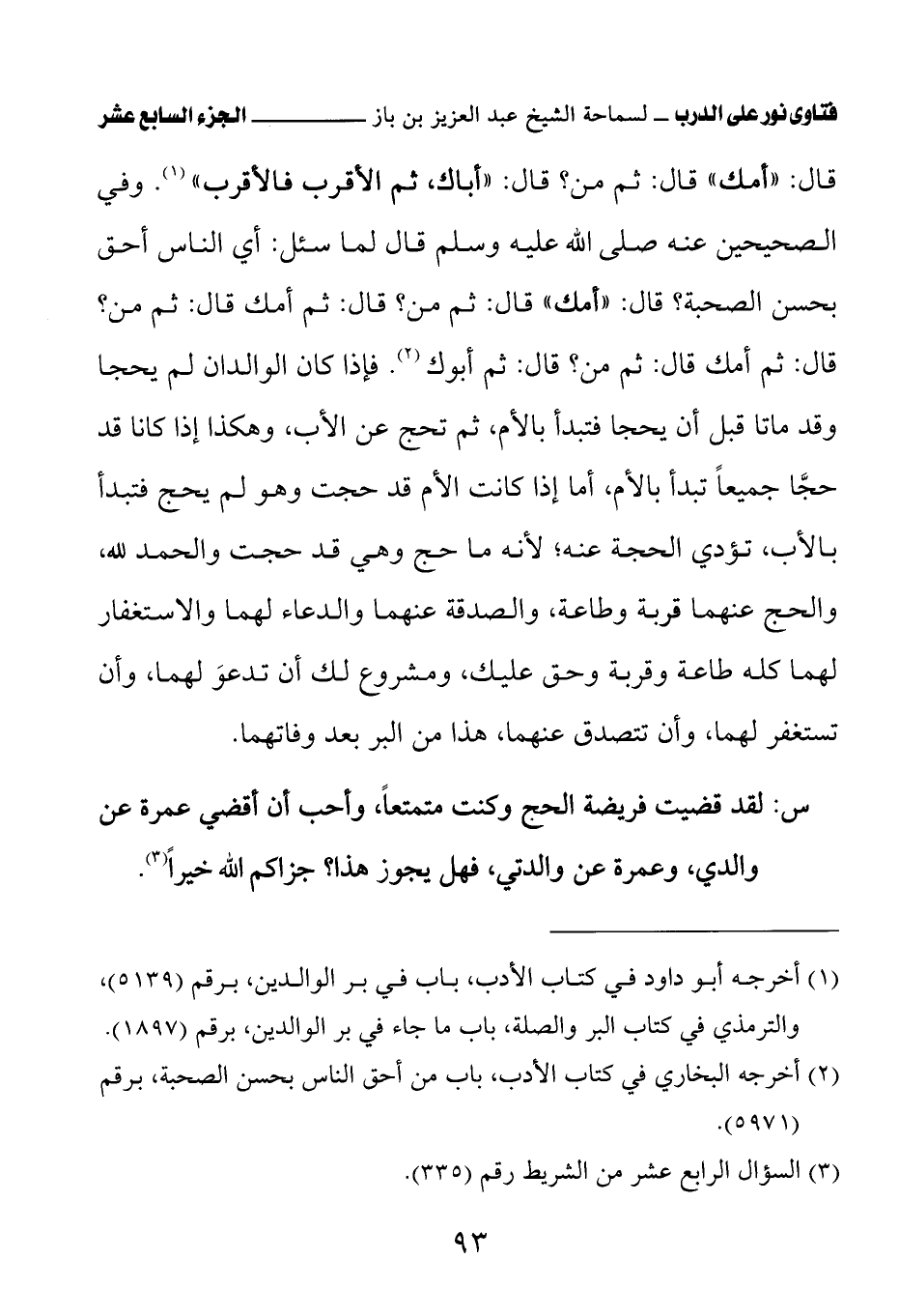 قال: "أمك" قال: ثم من؟ قال: "أباك، ثم الأقرب فالأقرب"» (¬1) وفي الصحيحين عنه صلى الله عليه وسلم قال لما سئل: «أي الناس أحق بحسن الصحبة؟ قال: "أمك" قال: ثم من؟ قال: ثم أمك قال: ثم من؟ قال: ثم أمك قال: ثم من؟ قال: ثم أبوك» (¬2) فإذا كان الوالدان لم يحجا وقد ماتا قبل أن يحجا فتبدأ بالأم، ثم تحج عن الأب، وهكذا إذا كانا قد حجَّا جميعًا تبدأ بالأم، أما إذا كانت الأم قد حجت وهو لم يحج فتبدأ بالأب، تؤدي الحجة عنه؛ لأنه ما حج وهي قد حجت والحمد لله، والحج عنهما قربة وطاعة، والصدقة عنهما والدعاء لهما والاستغفار لهما كله طاعة وقربة وحق عليك، ومشروع لك أن تدعوَ لهما، وأن تستغفر لهما، وأن تتصدق عنهما، هذا من البر بعد وفاتهما.