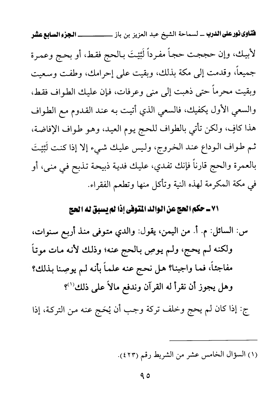 لأبيك، وإن حججت حجًا مفردًا لَبَّيْتَ بالحج فقط، أو بحج وعمرة جميعًا، وقدمت إلى مكة بذلك، وبقيت على إحرامك، وطفت وسعيت وبقيت محرمًا حتى ذهبت إلى منى وعرفات، فإن عليك الطواف فقط، والسعي الأول يكفيك، فالسعي الذي أتيت به عند القدوم مع الطواف هذا كافٍ، ولكن تأتي بالطواف للحج يوم العيد، وهو طواف الإفاضة، ثم طواف الوداع عند الخروج، وليس عليك شيء إلا إذا كنت لَبَّيْتَ بالعمرة والحج قارنًا فإنك تفدي، عليك فدية ذبيحة تذبح في منى، أو في مكة المكرمة لهذه النية وتأكل منها وتطعم الفقراء.