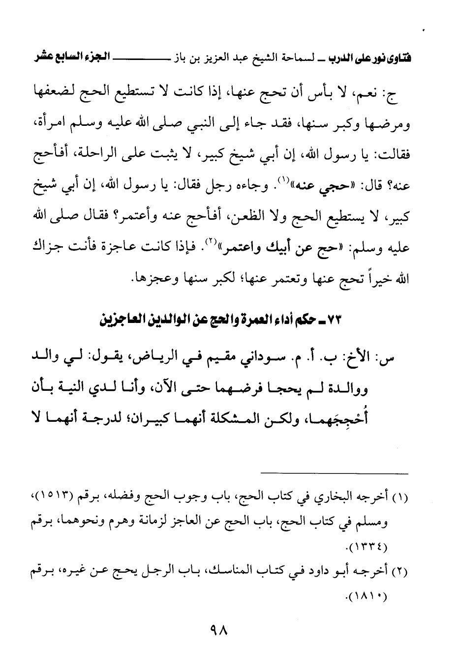 73 - حكم أداء العمرة والحج عن الوالدين العاجزين
