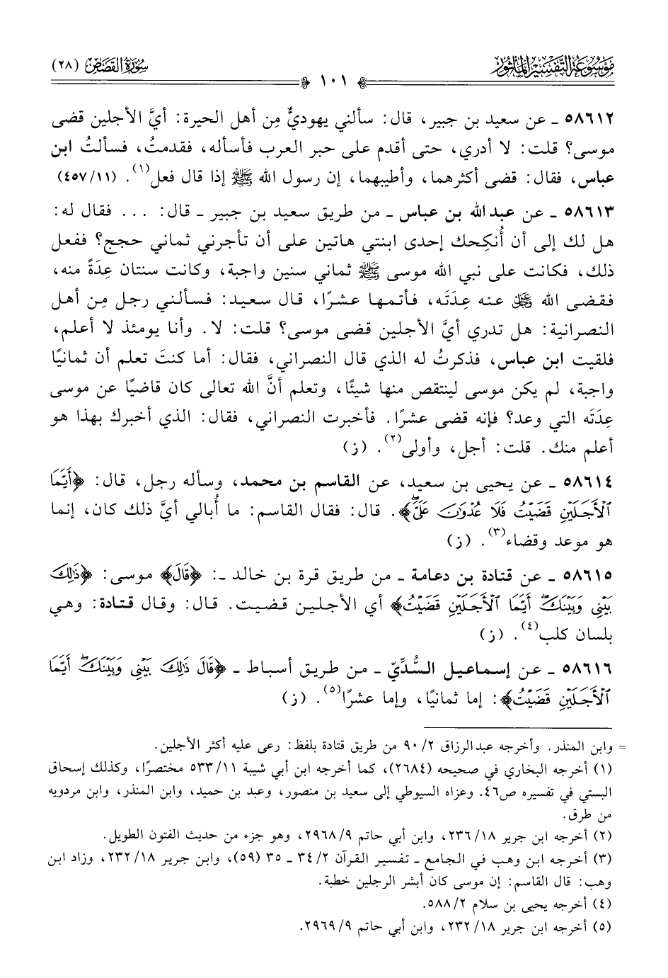 ٥٨٦١٣ - عن عبد الله بن عباس -من طريق سعيد بن جبير- قال: ... فقال له: هل لك إلى أن أُنكِحك إحدى ابنتي هاتين على أن تأجرني ثماني حجج؟ ففعل ذلك، فكانت على نبي الله موسى - صلى الله عليه وسلم - ثماني سنين واجبة، وكانت سنتان عِدَةً منه، فقضى الله - عز وجل - عنه عِدَتَه، فأتمها عشرًا، قال سعيد: فسألني رجل مِن أهل النصرانية: هل تدري أيَّ الأجلين قضى موسى؟ قلت: لا. وأنا يومئذ لا أعلم، فلقيت ابن عباس، فذكرتُ له الذي قال النصراني، فقال: أما كنتَ تعلم أن ثمانيًا واجبة، لم يكن موسى لينتقص منها شيئًا، وتعلم أنّ الله تعالى كان قاضيًا عن موسى عِدَتَه التي وعد؟ فإنه قضى عشرًا. فأخبرت النصراني، فقال: الذي أخبرك بهذا هو أعلم منك. قلت: أجل، وأولى (¬٢). (ز)