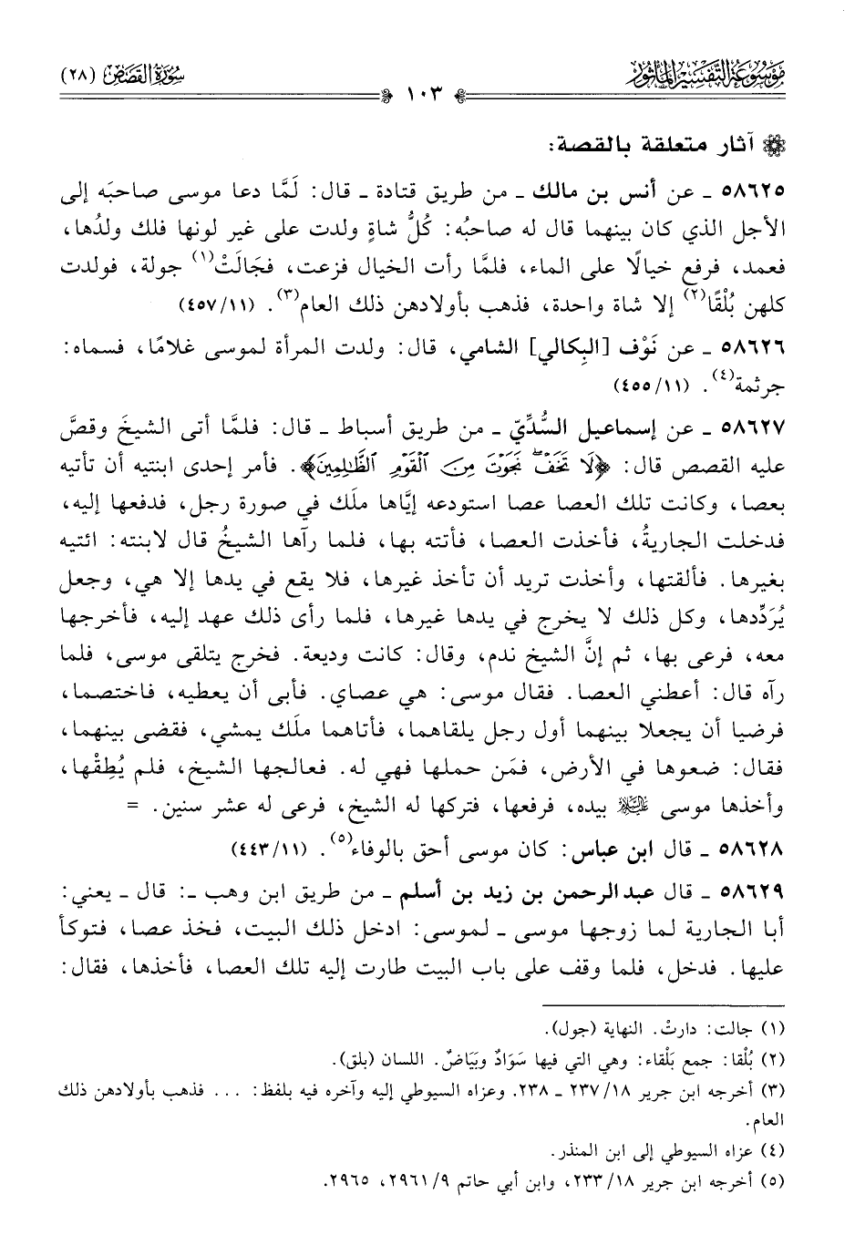 ٥٨٦٢٥ - عن أنس بن مالك -من طريق قتادة- قال: لَمّا دعا موسى صاحبَه إلى الأجل الذي كان بينهما قال له صاحبُه: كُلُّ شاةٍ ولدت على غير لونها فلك ولدُها، فعمد، فرفع خيالًا على الماء، فلمّا رأت الخيال فزعت، فجالَتْ (¬١) جولة، فولدت كلهن بُلْقًا (¬٢) إلا شاة واحدة، فذهب بأولادهن ذلك العام (¬٣). (١١/ ٤٥٧)