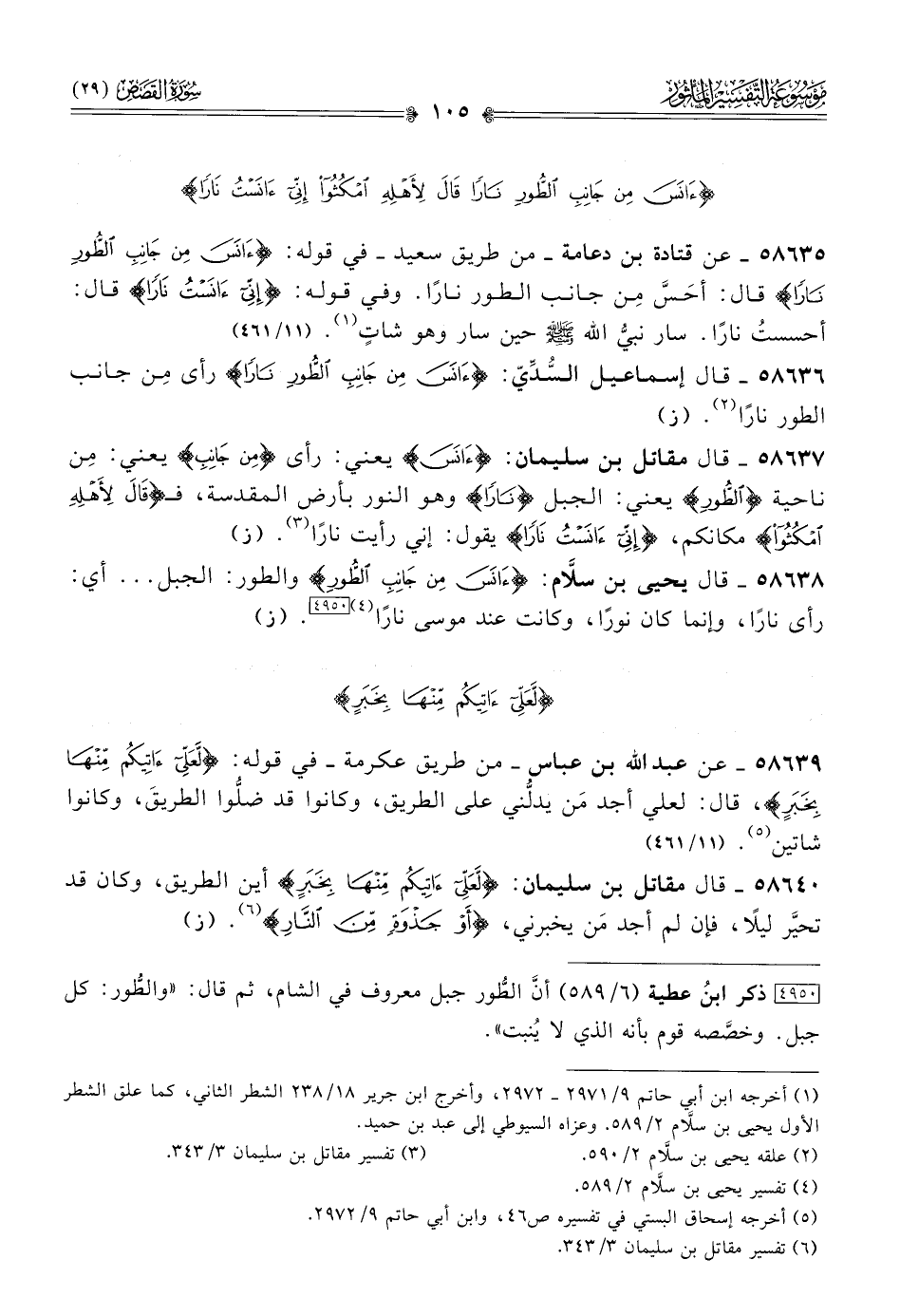 ٥٨٦٣٦ - قال إسماعيل السُّدِّيّ: {آنس من جانب الطور نارا} رأى مِن جانب الطور نارًا (¬٢). (ز)