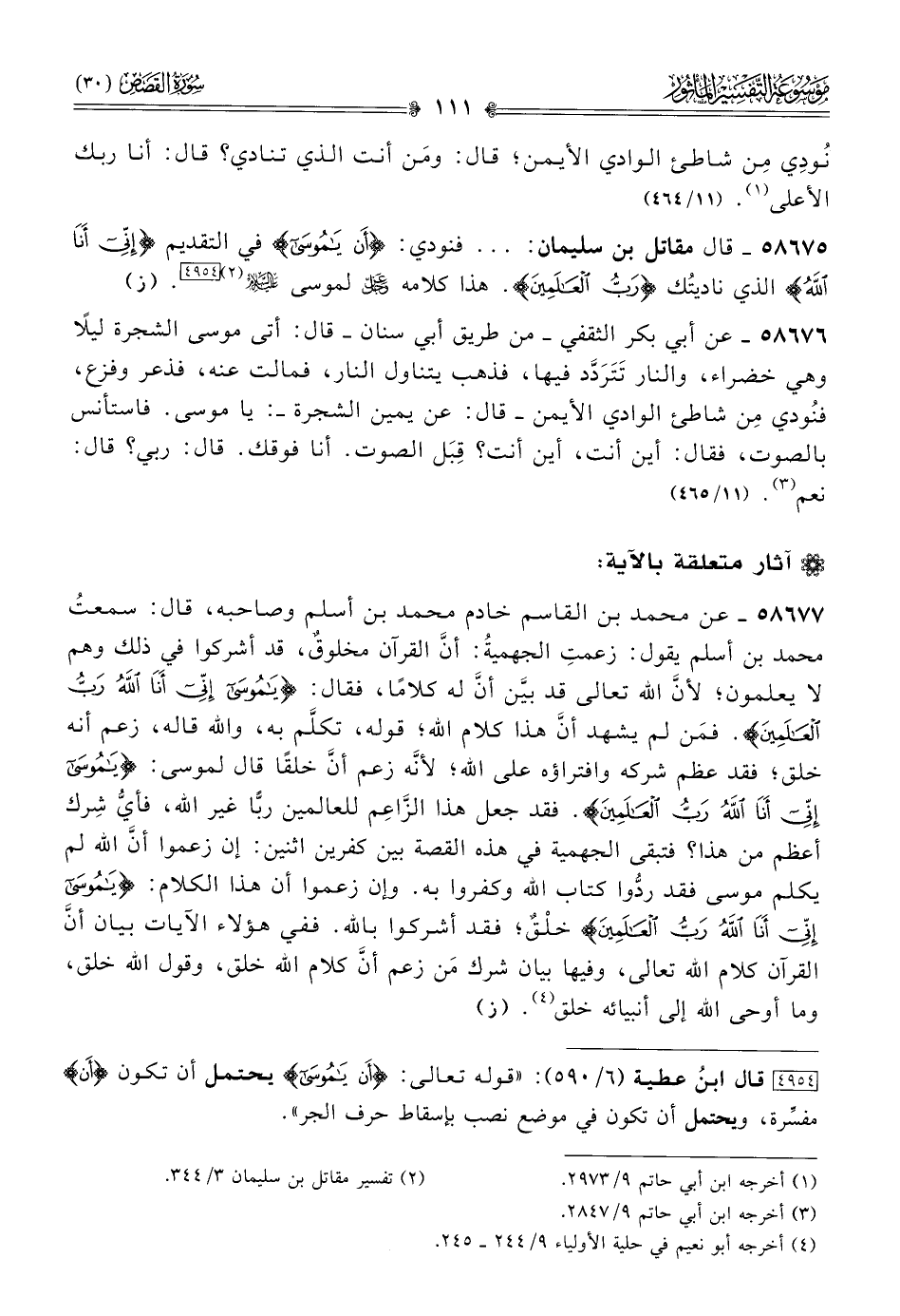 ٥٨٦٧٥ - قال مقاتل بن سليمان: ... فنودي: {أن يا موسى} في التقديم {إني أنا الله} الذي ناديتُك {رب العالمين}. هذا كلامه - عز وجل - لموسى - عليه السلام - (¬٢) [٤٩٥٤]. (ز)
