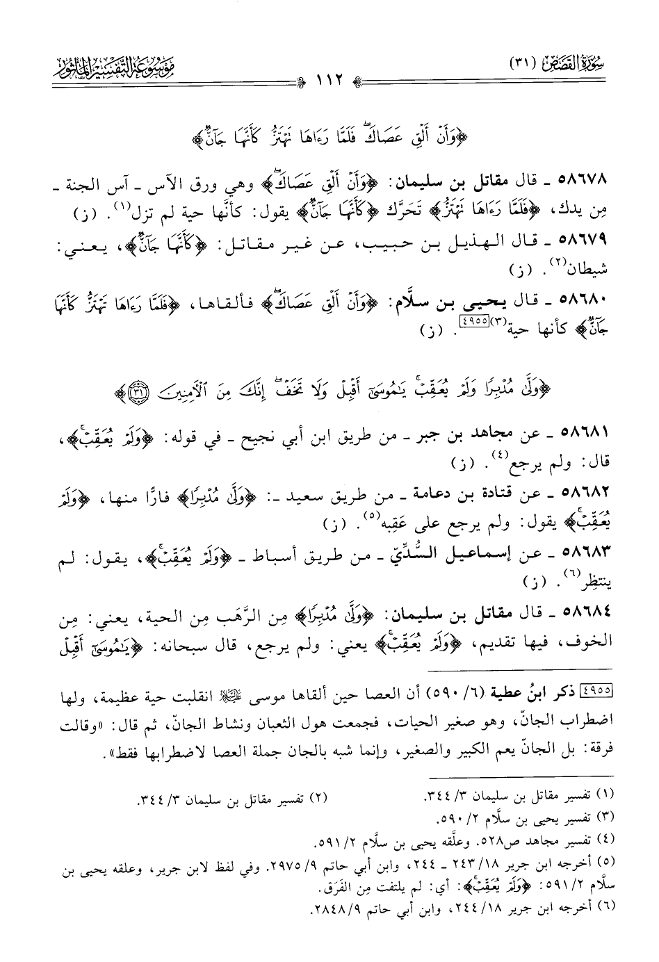 ٥٨٦٨٤ - قال مقاتل بن سليمان: {ولى مدبرا} مِن الرَّهَب مِن الحية، يعني: مِن الخوف، فيها تقديم، {ولم يعقب} يعني: ولم يرجع، قال سبحانه: {يا موسى أقبل
