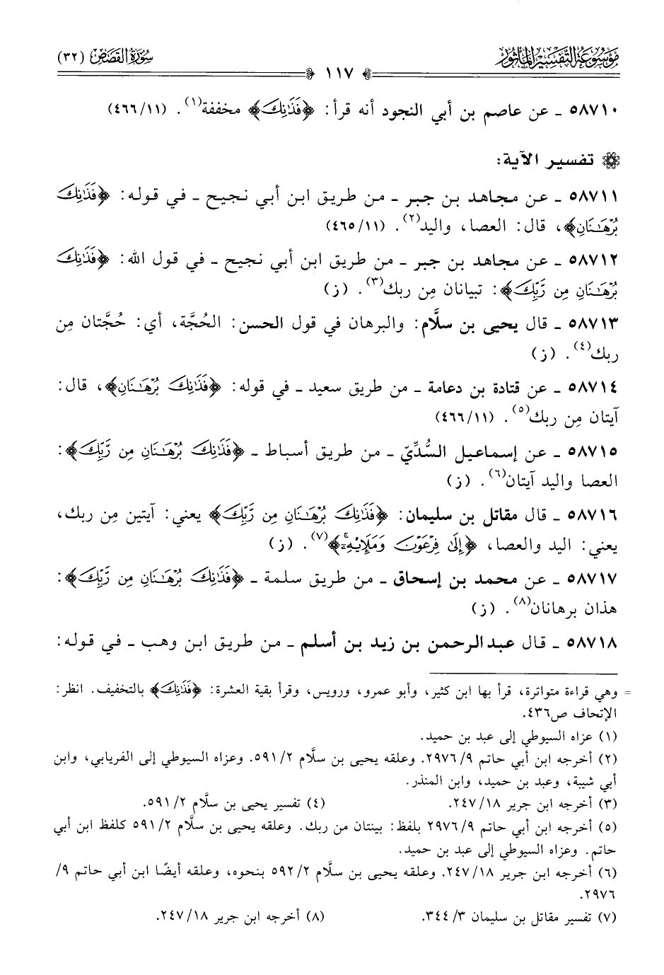 ٥٨٧١١ - عن مجاهد بن جبر -من طريق ابن أبي نجيح- في قوله: {فذانك برهانان}، قال: العصا، واليد (¬٢). (١١/ ٤٦٥)