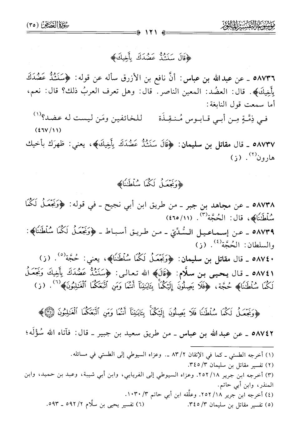 ٥٨٧٣٩ - عن إسماعيل السُّدِّيّ -من طريق أسباط- {ونجعل لكما سلطانا}: والسلطان: الحُجَّة (¬٤). (ز)