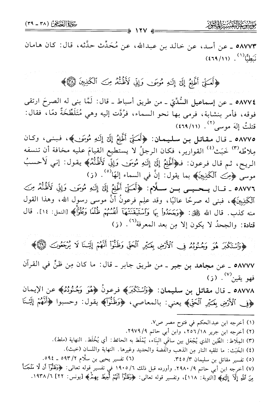 ٥٨٧٧٦ - قال يحيى بن سلّام: {لعلي أطلع إلى إله موسى وإني لأظنه من الكاذبين}، فبنى له صرحًا عاليًا، وقد علِم فرعونُ أنّ موسى رسول الله، وهذا القول منه كذب. قال الله - عز وجل -: {وجحدوا بها واستيقنتها أنفسهم ظلما وعلوا} [النمل: ١٤]. قال قتادة: والجحدُ لا يكون إلا مِن بعد المعرفة (¬٦). (ز)
