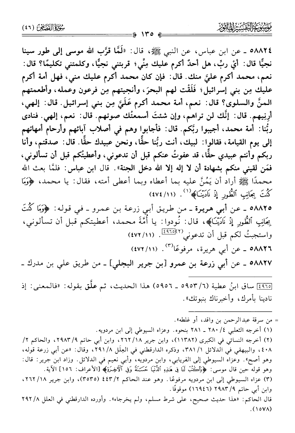 ٥٨٨٢٥ - عن أبي هريرة -من طريق أبي زرعة بن عمرو- في قوله: {وما كنت بجانب الطور إذ نادينا}، قال: نُودوا: يا أُمَّةَ محمد، أعطيتكم قبل أن تسألوني، واستجبتُ لكم قبل أن تدعوني (¬٢) [٤٩٦٥]. (١١/ ٤٧٢)