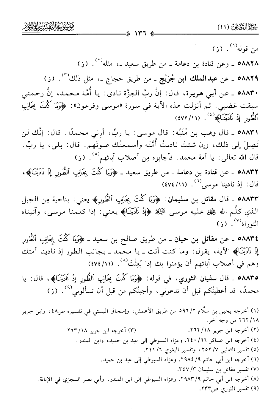 ٥٨٨٣٥ - قال سفيان الثوري، في قوله: {وما كنت بجانب الطور إذ نادينا}، قال: يا محمدُ، قد أعطيتُكم قبل أن تدعوني، وأجبتُكم من قبل أن تسألوني (¬٩). (ز)